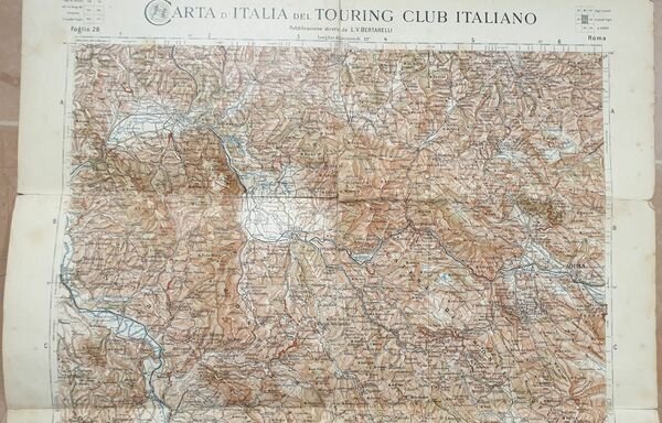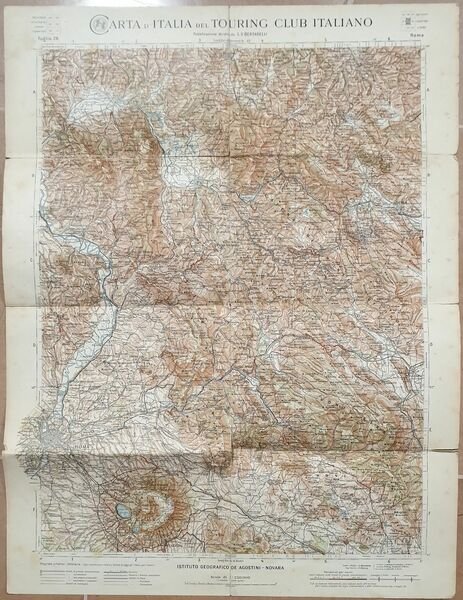 Bella mappa del 1910 circa, foglio 28, della Carta d'Italia del Touring Club italiano a cura di Bertarelli.<BR>La mappa riguarda la zona di Roma. Insieme alla mappa indice e custodia originale.<BR>DIMENSIONI FOGLIO: cm 51,5x39,5 DIMENSIONI INCISIONE: cm 45x34 EPOCA: 1910 CONDIZIONI: Discrete. Piegatura verticale. StrappiBeautiful map of 1910 circa, page 28, of the Italian map of Touring Club italiano by Bertarelli.<BR>The map relates the area of Rome. Together with the map index and original cover.<BR>LEAF DIMENSION: 51,5x39,5 ENGRAVING DIMENSION: cm 45x34 DATE: 1910 CONDITIONS:Fair conditions. Vertical folding. Tears