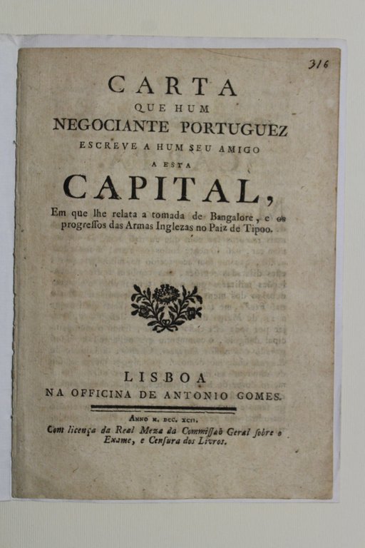 Carta que hum negoziante portuguez ecreve a hum seu amigo a esta capital, em quel he relata a tomaia de Bangalore, e os progressos das Armas Inglezas no Paiz de Tipoo.