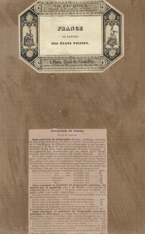 Paris, Ch. Picquet, 1841, grande carta geografica della Francia (ma che comprende anche gran parte dell'Italia, della Germania, dell'Austria e della Polonia, nonché la parte nord della Spagna e il sud dell'Inghilterra), incisa in rame con confini degli stati e dipartimenti (francesi) colorati a mano. Complessivamente misura mm. 1330x2000, ma è divisa in 4 sezioni, ciascuna delle quali è intelata in ulteriori sezioni e ripiegata. Le 4 sezioni ripiegate sono conservate in un cofanetto coevo in cartone marmorizzato. Eccellenti condizioni.