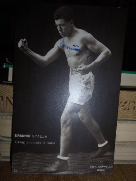 Cartolina autografo di Erminio Spalla. Erminio Spalla è stato un pugile, attore, scultore e cantante lirico italiano. Fu il primo pugile italiano a conquistare il titolo di Campione europeo, negli anni venti. Era il fratello minore di Giuseppe Spalla, anch'egli pugile.