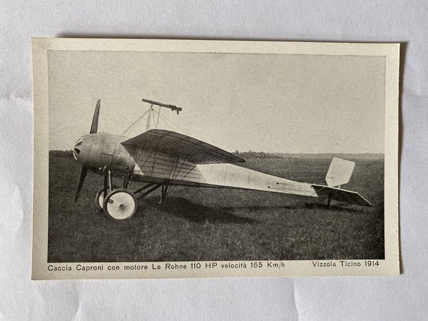 Cartolina Caccia Caproni con motore Le Rohne 110 HP velocità 165 Km/h Vezzola Ticino 1914