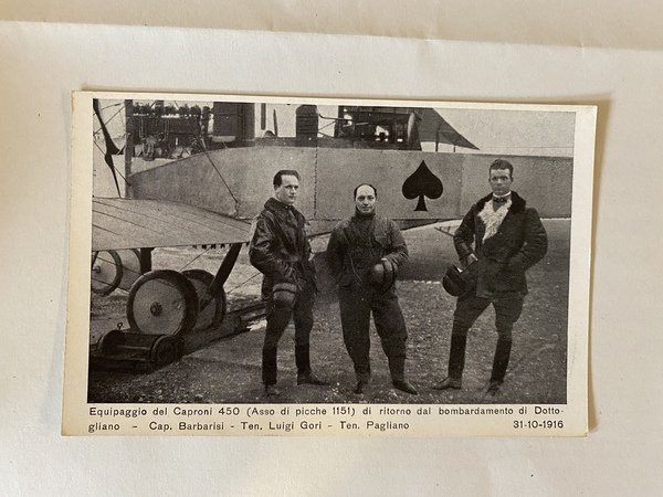 Cartolina Equipaggio del Caproni 450 (Asso di picche 1151) Cap. Barbarisi Ten. Luigi Gori Ten. Pagliano 31-10-1916