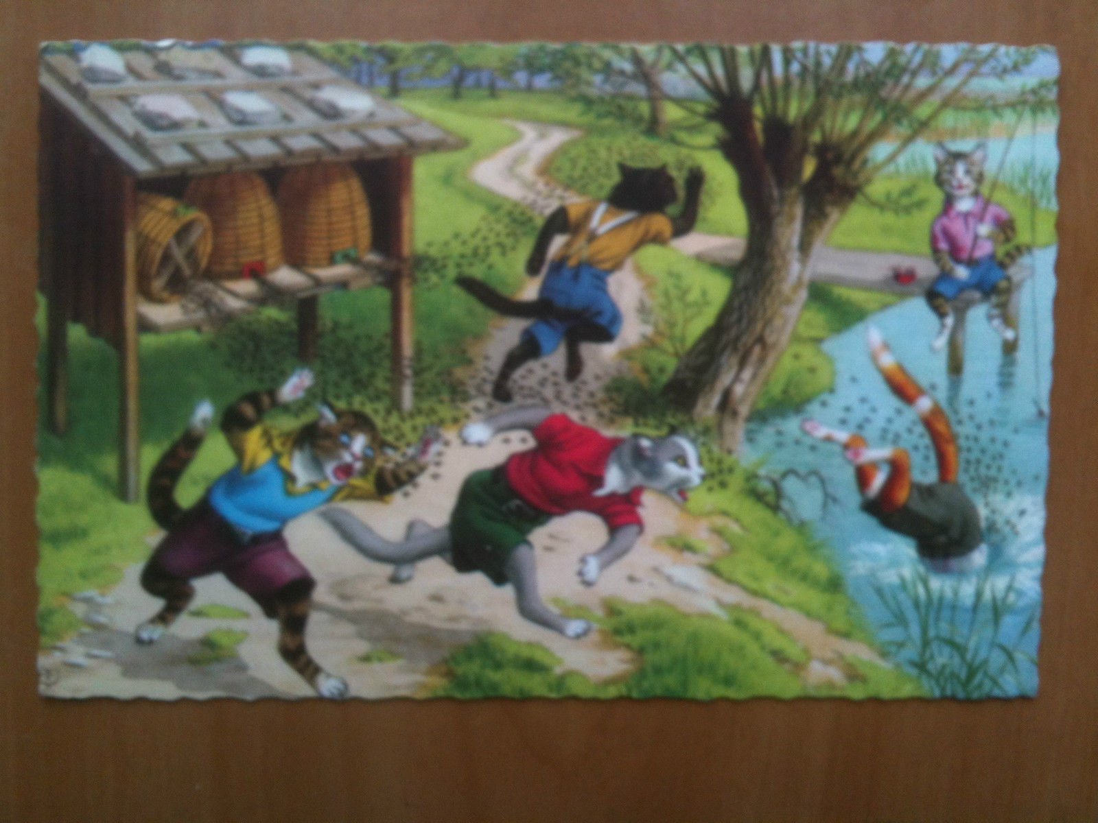 Cartolina illustrata metà '900Gatti antropomorfiscappano dalle apinon viaggiata - in buono stato e1233