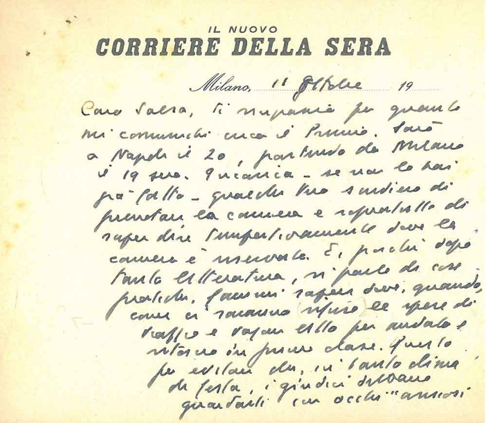 Cartolina intestata: "Il nuovo Corriere della Sera" datata: Milano, 11 ottobre 19.
