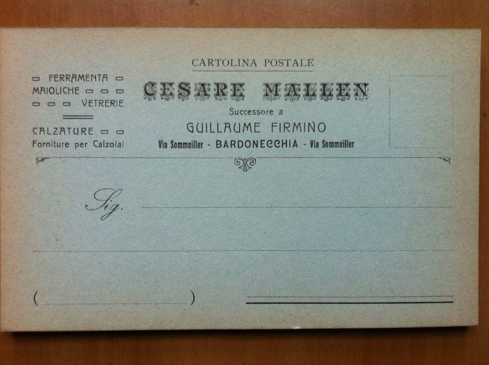 Cartolina pubblicitari originale anni '20CESARE MALLENBardonecchiaFerramenta Maioliche VetrerieCalzature forniture per calzolaiin ottime condizioni non viaggiata - formato 14,5x9 cm (2 g)E14240