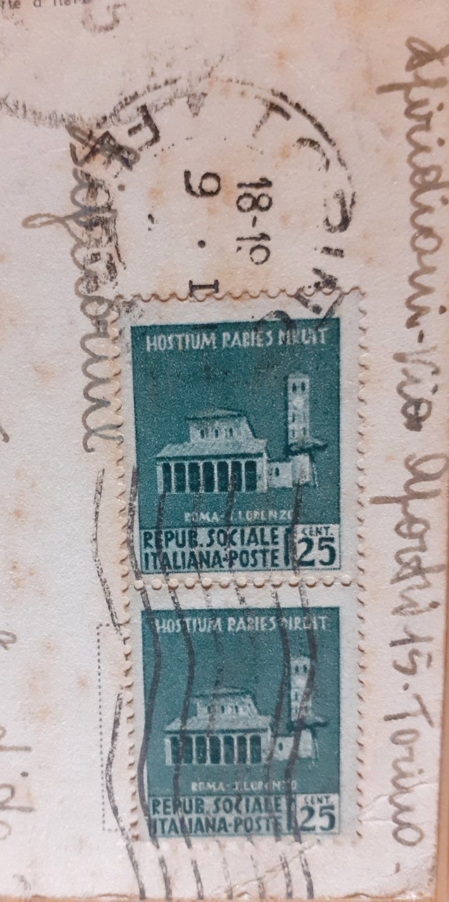 Cartolina viaggiata con due francobolli Hostium Rabies Diruit RSI