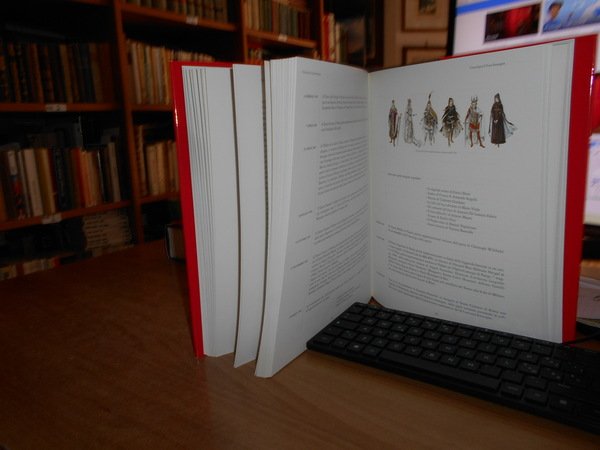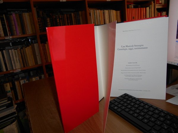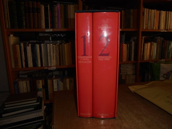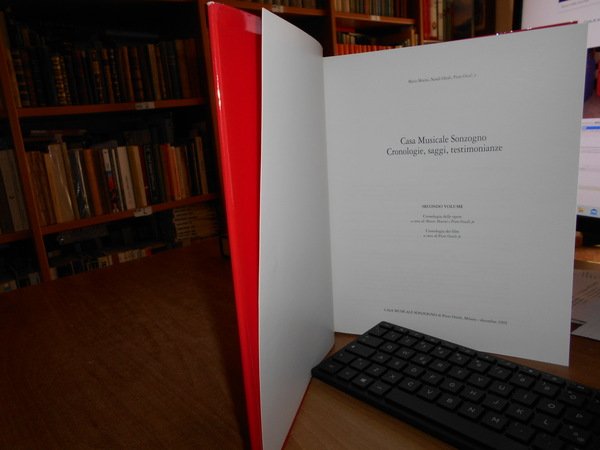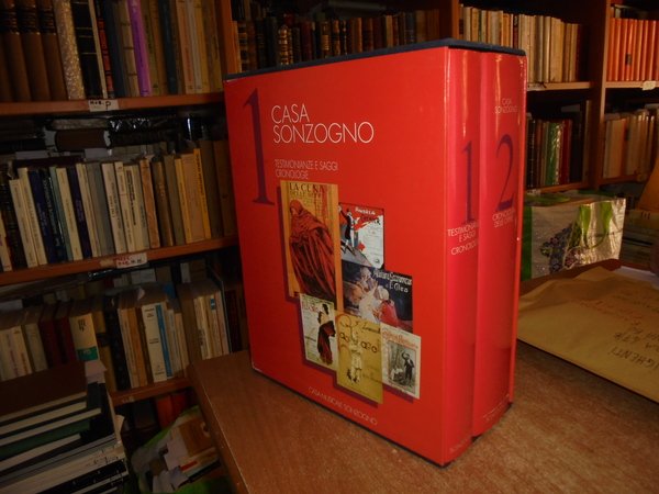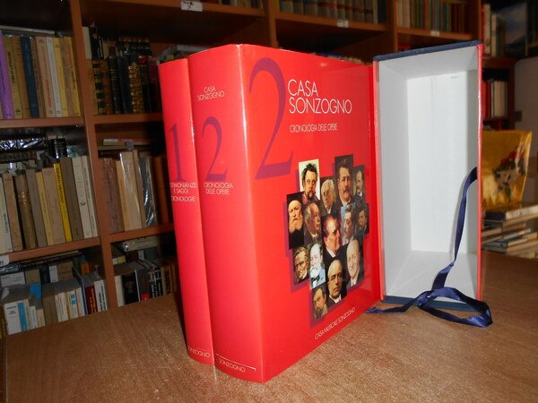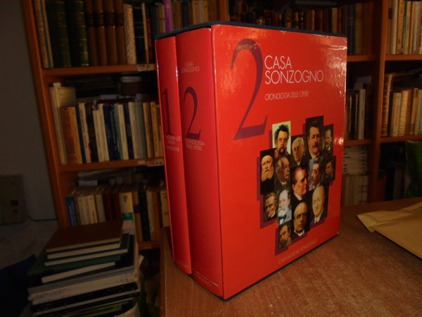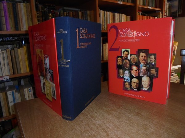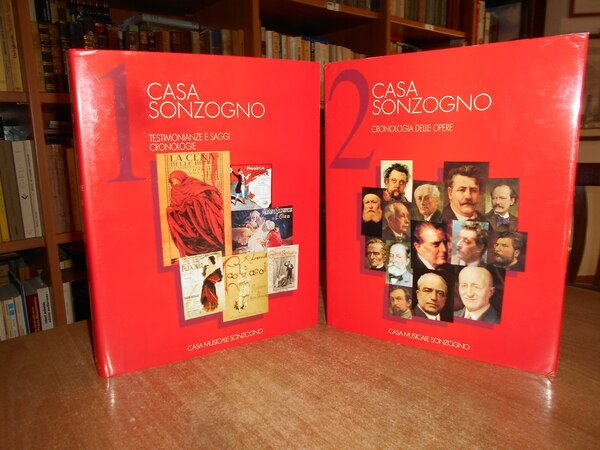 Mario Morini. Nandi Ostali. Piero Ostali jr. Milano, Casa Musicale Sonzogno di Piero Ostali, Dicembre 1995. CASA SONZOGNO. Testimonianze e Saggi Cronologie. Cronologia delle Opere. 2 volumi in-4°, tela bleu scuro con titoli in oro. Vol. I. Testimonianze e Saggi Cronologie. Presentazione di Carlo Fontana. 517 pp.; Vol. II. Cronologia delle Opere. A cura di Mario Morini e Piero Ostali jr. Cronologia dei film a cura di Piero Ostali jr. 907 pp. è presente il segnalibro in cotone. I due volumi sono corredati da innumerevoli illustrazioni a colori e in bianco e nero n.t. Volumi come nuovi. Cofanetto in ottimo stato di conservazione. Uff. stanzetta mob. a destra.