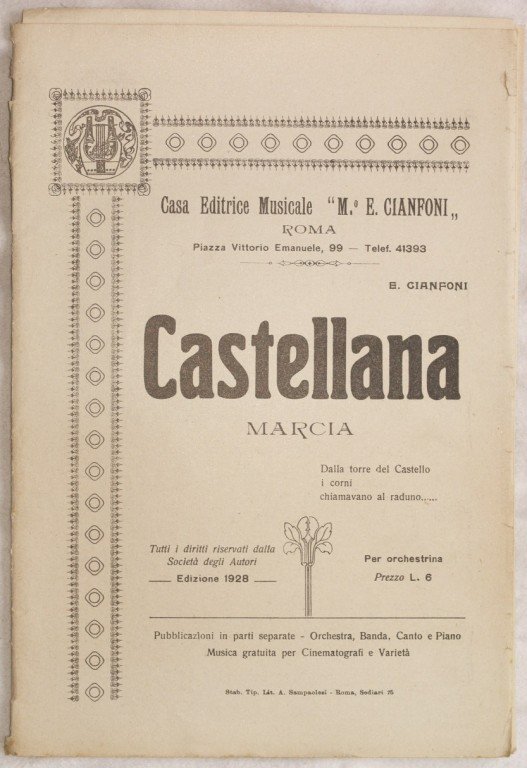 In 8. cm 26,5x18. pp 14. partitura completa per orchestra del 1928 circa di una canzone.<BR>Caratteristica copertina illustrata d'epoca. Ex libris sulla copertina. In ottime condizioni. a complete score for orchestra of 1928. Carachteristic decorated cover of that period. Ex libris in the cover. In very good conditions.