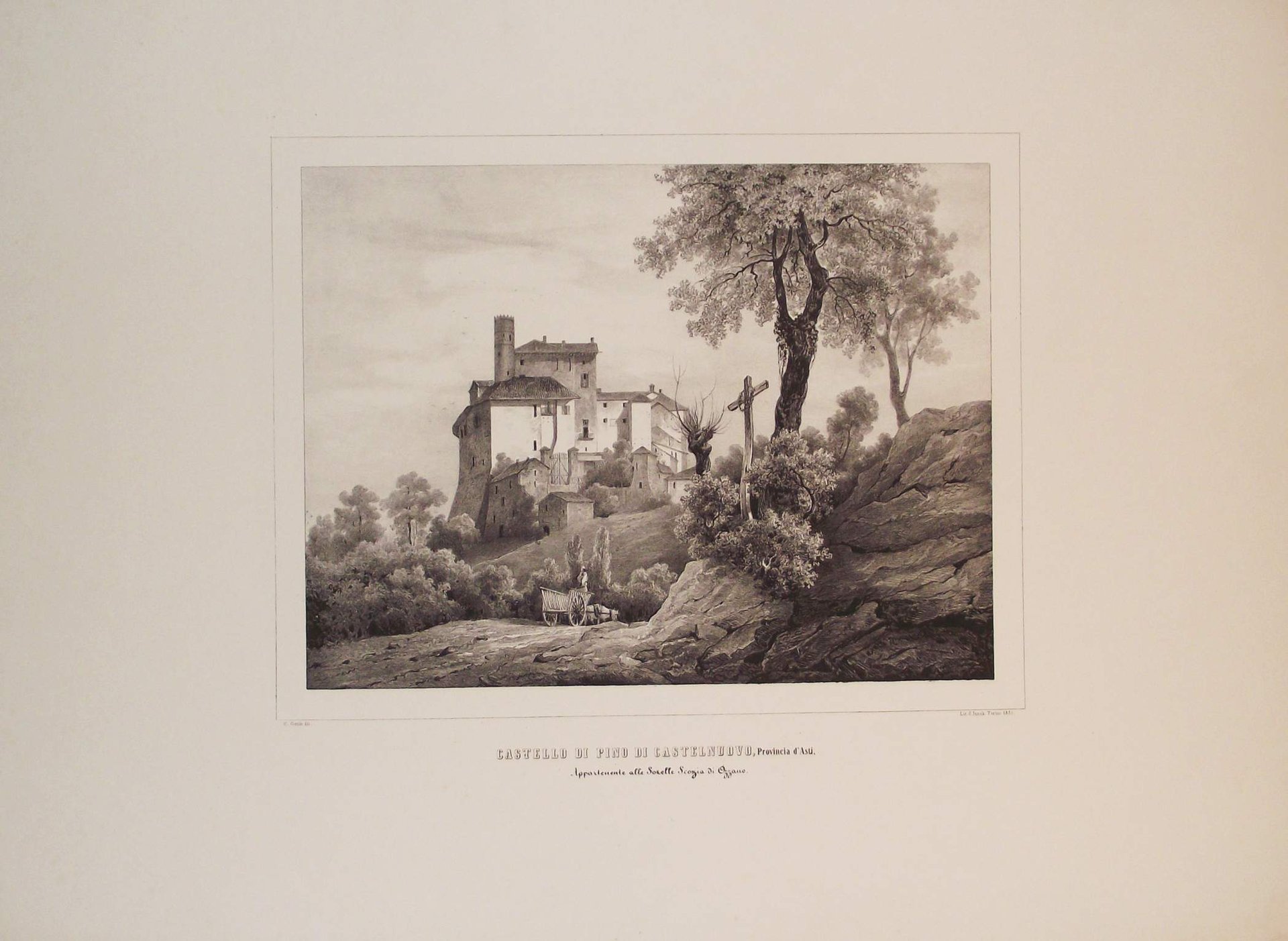 >Litografia originale circa 470x635 mm, firmata da Enrico Gonin quale autore del disegno e da J. Junck, Fr.lli Doyen o D.Festa quali litografi. Bella veduta animata da personaggi in primo piano, è l'unica incisione di Pino Castelnuovo, realizzata prima della metà dell'800. Impressi nel margine inferiore sono il titolo e l'indicazione della famiglia nobile proprietaria. Bell'esemplare a pieni margini tratto dall'Album delle principali Castella Feudali della Monarchia di Savoia. Torino, Fontana, 1841-57, contenente 200 tavole solelitografiche disegnate e litografate da Enrico Gonin impresse a Torino da D. Festa, Junck e Doyen, celebre serie di vedute dei castelli e ville del Piemonte e Valle d'Aosta Enrico Gonin (Torino, 1798-1856), fratello del più noto pittore Francesco; discepolo di Pietro Giovanni Palmieri, ereditò da questi l'arte litografica, e lavorò profusamente per gli editori Marietti, Doyen e Fontana. Queste vedute, espressione di un tardo romanticismo pittorico, oltre ai loro pregi artistici e alla loro importanza per la storia dell'arte litografica in Piemonte, costituiscono un documento di eccezionale valore per lo studio del patrimonio monumentale del Piemonte.Buon esemplare a pieni margini.