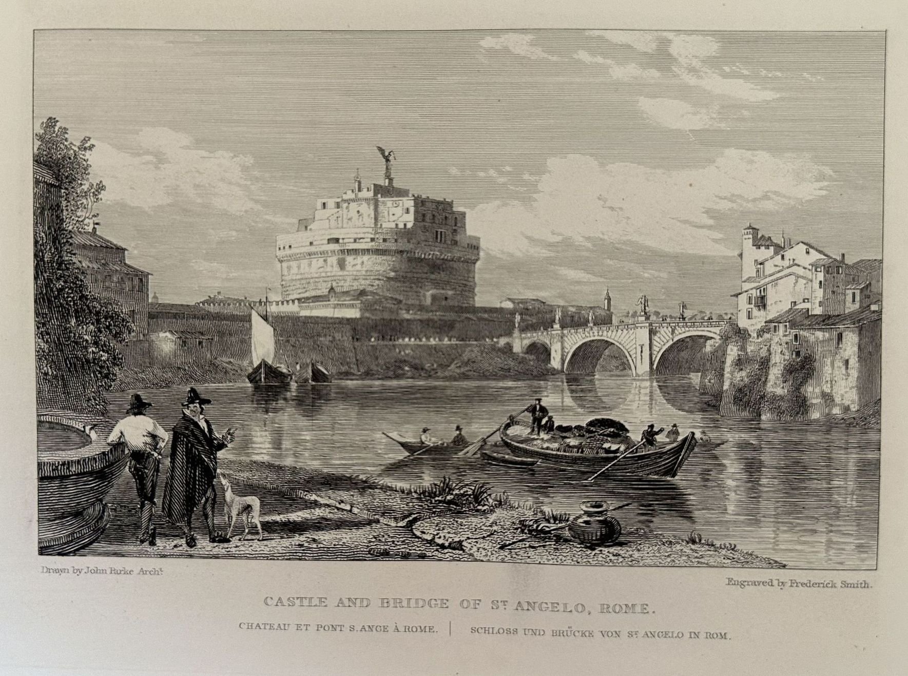 Veduta di Castel Sant'Angelo. Atlante: Rome and its surrounding scenery Autore: Frederick Smith su disegno di John Parke Data: 1840 circa Tecnica: Litografia Dimensione del foglio: 27,5x20,5 cm Dimensione incisione: 16,5x10,5 cm Condizioni: Buone. Alcune fioritureView of Castle and Bridge of St. Angelo, Rome. Atlas: Rome and its surrounding scenery Author: Frederick Smith after W. L. Leitch Date: 1840 circa Technique: Lithography Leaf Dimension:27,5x20,5 cm Engraving Dimension: 16,5x10,5 cm Conditions: Good conditions. Some foxing.