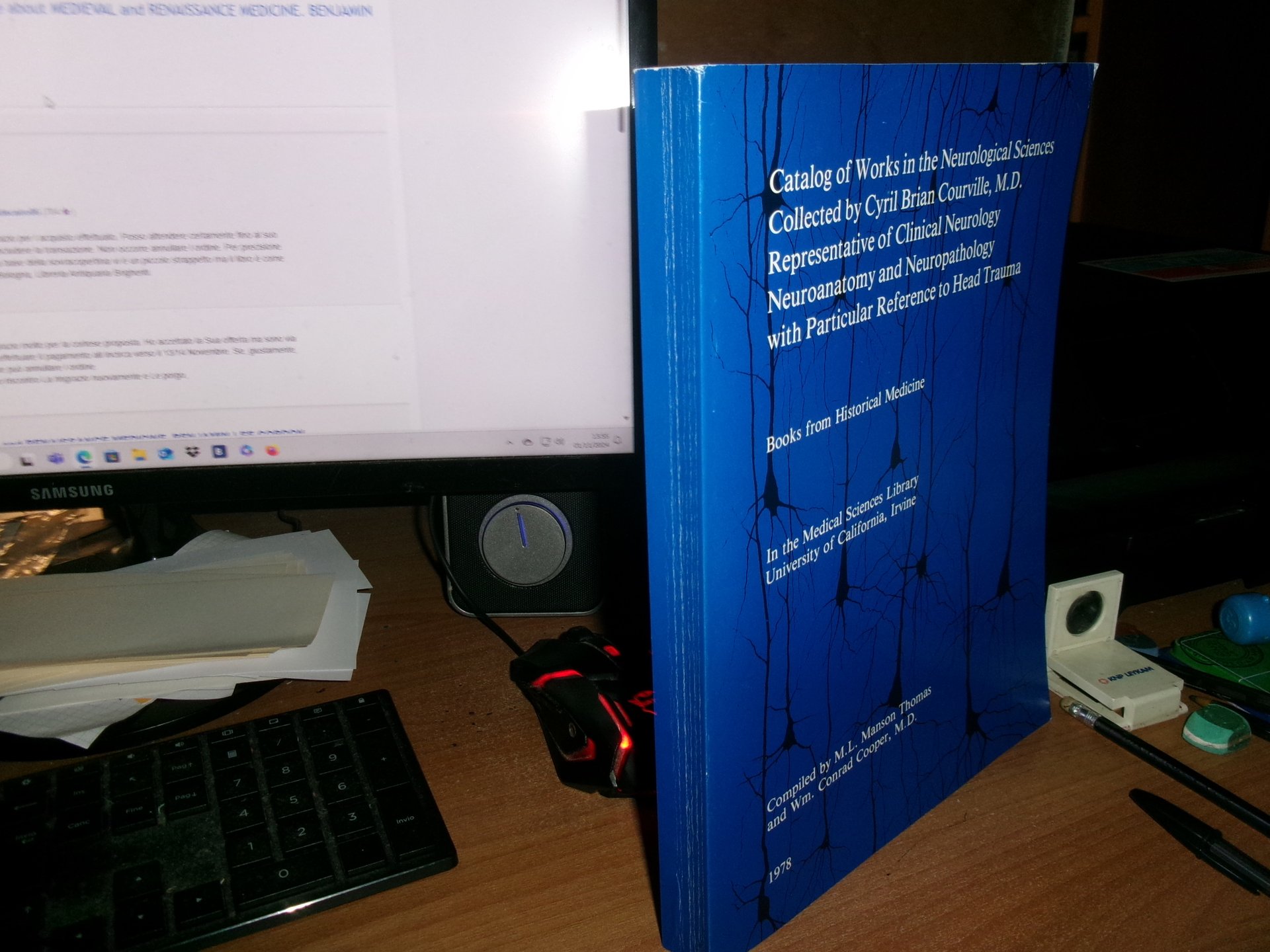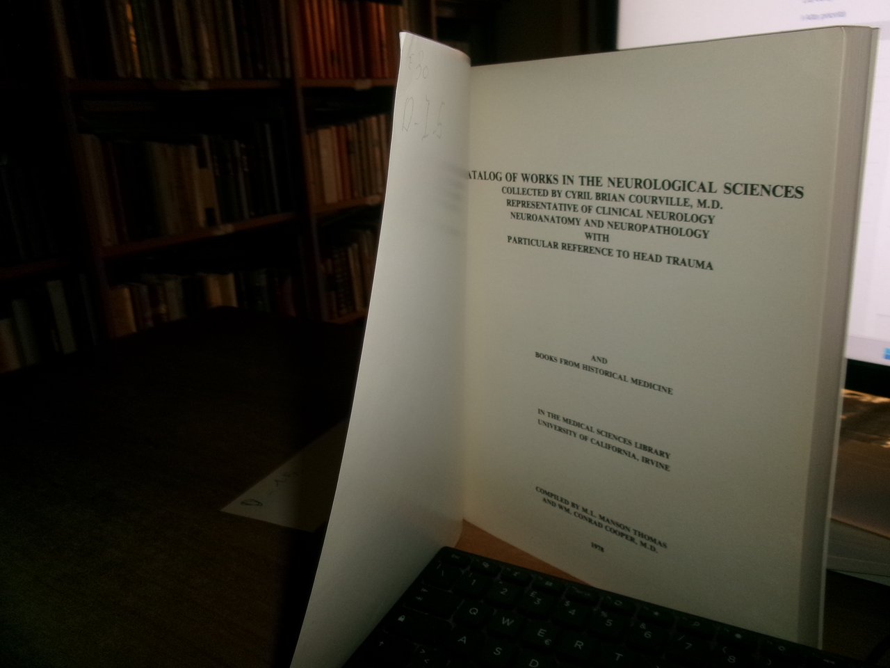 [Neurology]. THOMAS, M.L. Manson and Conrad COOPER. Irvine, Regents of the University of California, 1978. Catalog of Works in the Neurological Sciences collected by Cyril Brian Courville, M.D. Representative of Clinical Neurology, Neuroanatomy and Neuropathology with Particular Reference to Head Trauma. Books from Historical Medicine In the Medical Sciences Library, University of California, Irvine. In-4°, br. 239 pp. con una illustrazione. Ottimo stato con testo in inglese. Uff. D - I - 5