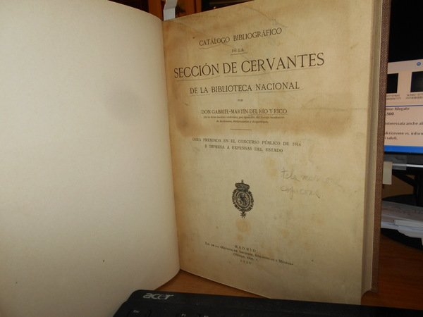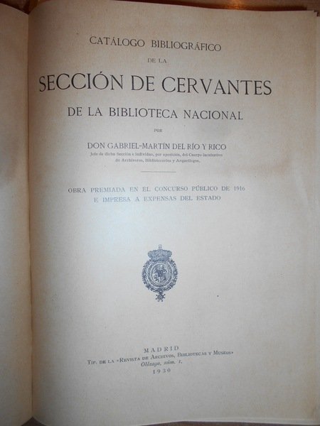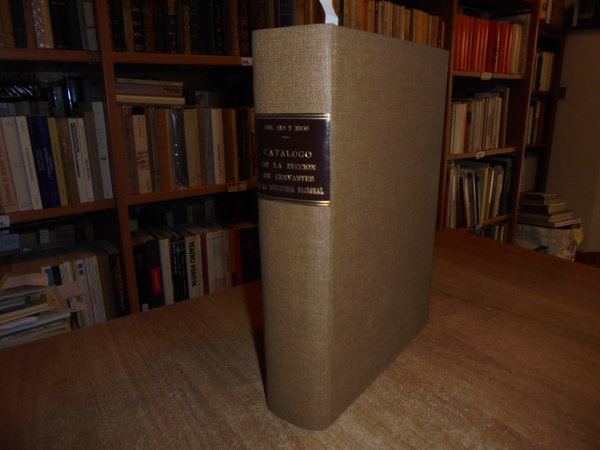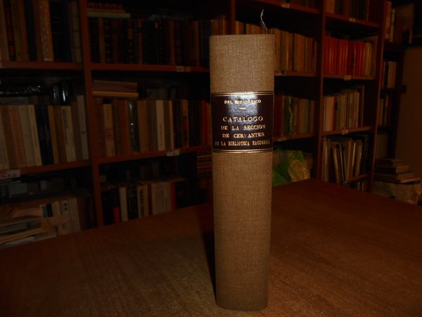 MARTÍN DEL RÍO Y RICO. Madrid,1930. Tip. De la Revista de Archivos, Bibliotecas y Museos, 1930. CATÁLOGO BIBLIOGRÁFICO DE LA SECCIÓN DE CERVANTES DE LA BIBLIOTECA NACIONAL. MARTÍN DEL RÍO Y RICO. In-4° (27 x 19 cm.), tela con titolo in oro entro tassello al dorso. XVIII, 915 pp. con alcune illustrazioni nel testo. Texto a dos columnas. Ottimo esemplare in legatura recente con le copertina originali conservate. Uff. E - V - 5 - 2