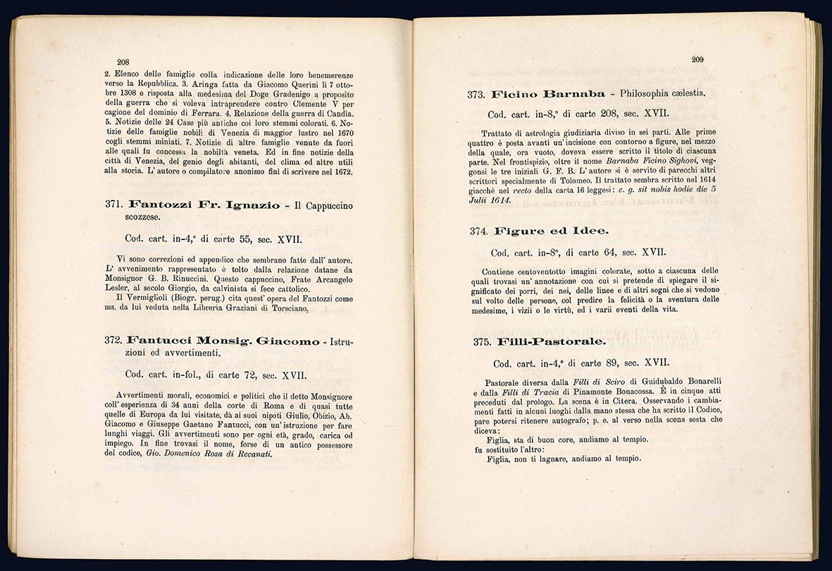 In 8° grande (mm 236x174), pp. (4), 151-311. Brossura editoriale stampata, con invio autografo del Campori a Lud. Coccapani Imperiale. Nell'opera sono descritti i codici numerati da 210 a 728. Ottima copia.