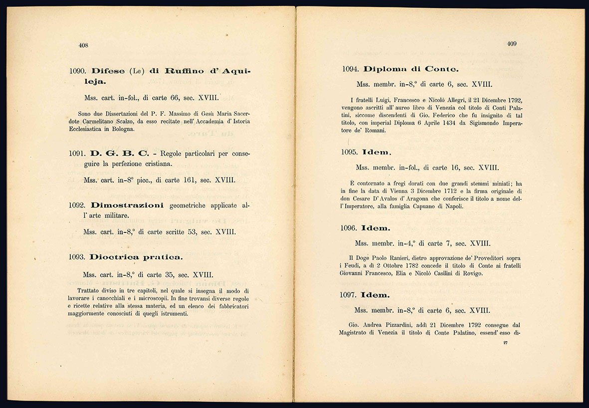 In 8° grande (mm 238x173); occhiello + pp. 315-699 (mss. nr. 729-2213), indice degli Autori in fine. Brossura editoriale stampata (un po' scolorita). Ottima copia.