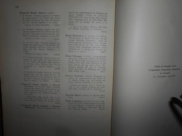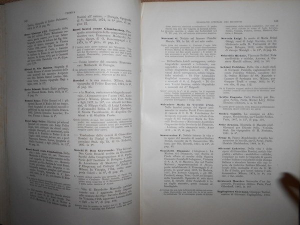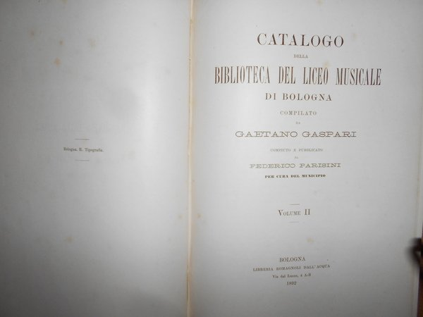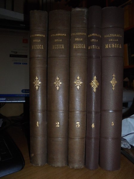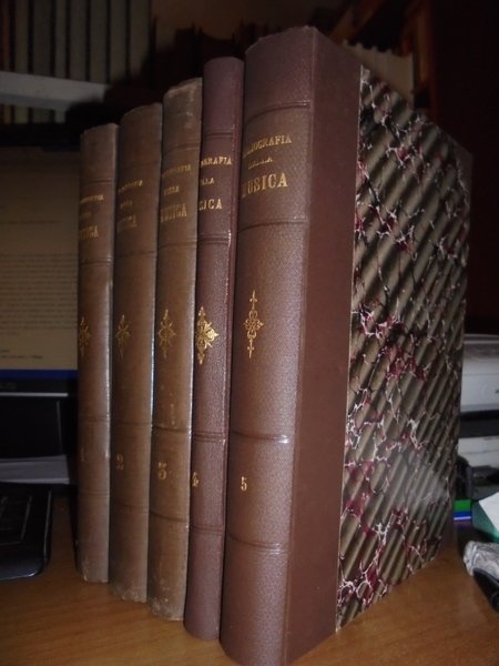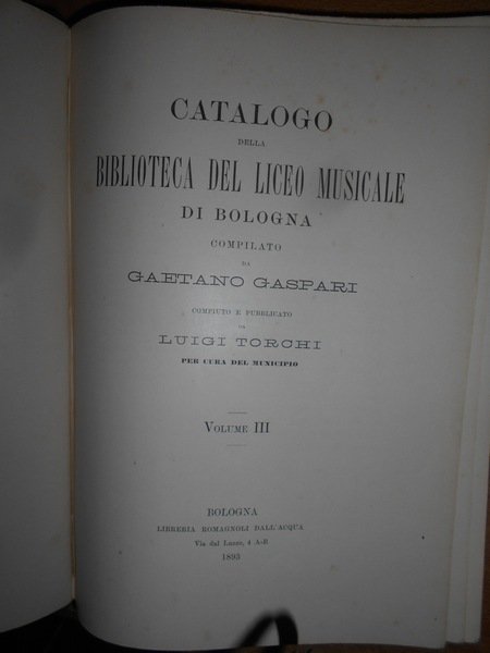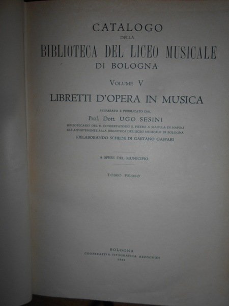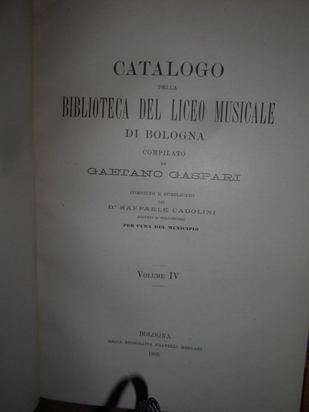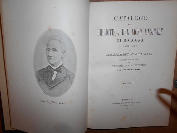 GASPARI GAETANO. (Musica - Bologna - Liceo musicale - Biblioteca - Catalogo Gaspari) Cinque volumi in 8°, legatura coeva in mezza tela con punte, titoli e fregi in oro ai dorsi. Volume I : "Teorica", compiuto e pubblicato da Federico Parisini per cura del Municipio, Libreria Romagnoli Dall'Acqua, 1890, pp. XXXIX,(1), 417,(3), con ritratto di Gaetano Gaspari in antiporta. Volume II : "Pratica" (Musica religiosa), compiuto e pubblicato da Federico Parisini per cura del Municipio, Libreria Romagnoli Dall'Acqua, 1892, pp. VIII,573,(3). Volume III : "Pratica" (Musica sacra-Oratorii-Musica vocale profana-Musica vocale moderna da camera e da concerto-Melodrammi) compiuto e pubblicato da Luigi Torchi per cura del Municipio, Libreria Romagnoli Dall'Acqua, 1893, pp. (6),389,(3). Volume IV : "Pratica" (Musica strumentale-Appendice di Opere pedagogiche e varie-Collezioni) compiuto e pubblicato da Raffaele Cadolini per cura del Municipio, RegiaTipografia Merlani, 1905, pp. VIII,279,(1). Volume V: Bologna, Cooperativa Tipografica Azzoguidi, 1943. Libretti d' Opera in Musica preparato e pubblicato dal Prof. Dott. Ugo Sesini. xvi, 560 pp. Opera completa in edizione originale in legatura coeva perfettamente conservata. Uff. E - V - 1