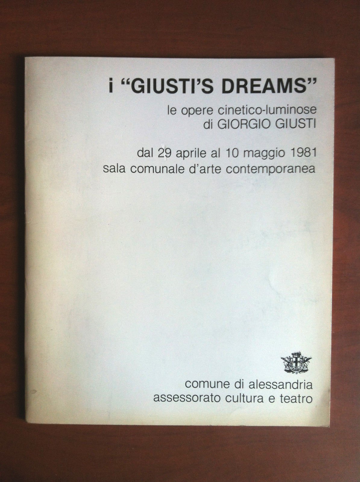 GIORGIO GIUSTI"I GIUSTI'S DREAMS"Le opere cinetico-luminoseCatalogo della mostra tenutasi pressoComune di Alessandria Sala Comunale di Arte Comtemporanea29 Aprile - 10 Maggio 198124 pagine - immagini b/nformato 20x24 cmin ottimo stato (gr. 110)E12999