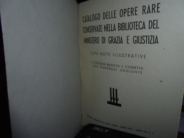 CATALOGO delle OPERE RARE CONSERVATE nella BIBLIOTECA del MINISTERO di GRAZIA e GIUSTIZIA con note illustrative. 2a edizione riveduta e corretta con numerose aggiunte. Roma, Istituto Poligrafico dello Stato, 1938. In-8° piccolo, cartoncino edit. 75 pp. Raro opuscolo ben conservato. Uff. A - II - 3 - 2