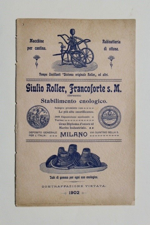 In 8° (mm 240x150); pagg. 32 con decine di illustrazioni di pompe, apparecchi enologici, macchine capsulatrici ed altro proposti dalla ditta Roller alla fiera di Milano del 1902. Brossura coeva figurata (staccata dal testo). Ben conservato