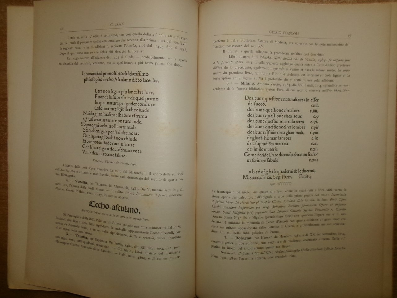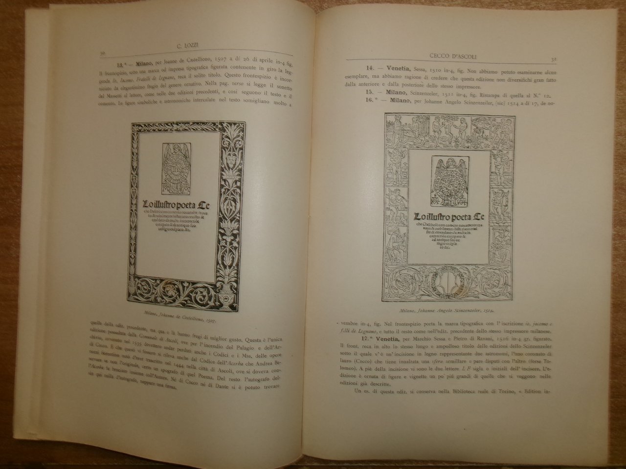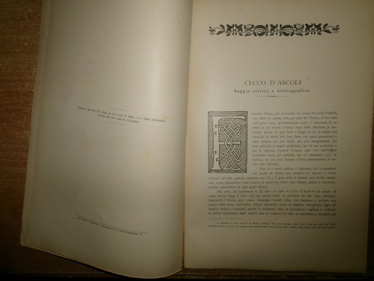 CARLO LOZZI. Firenze, Leo S. Olschki, 1903. CECCO D' ASCOLI. Saggio critico e bibliografico. In-8° grande, br. orig. 39 pp. con alcuni fac-simili b.t. Normali segni del tempo ma molto ben conservato. Neg. mob. 10 in busta trasp.