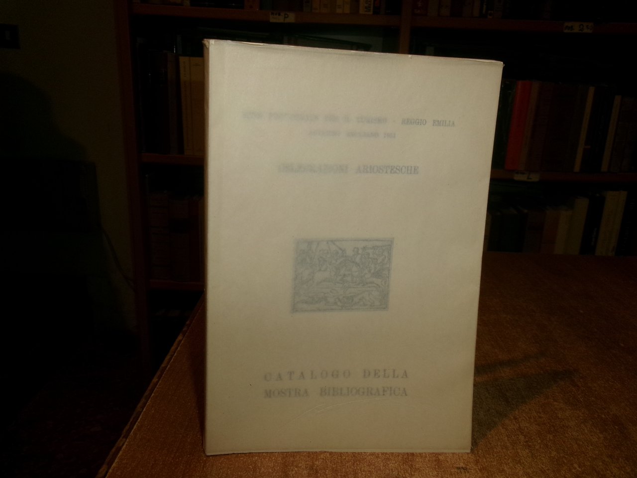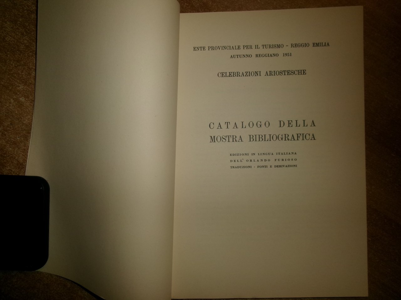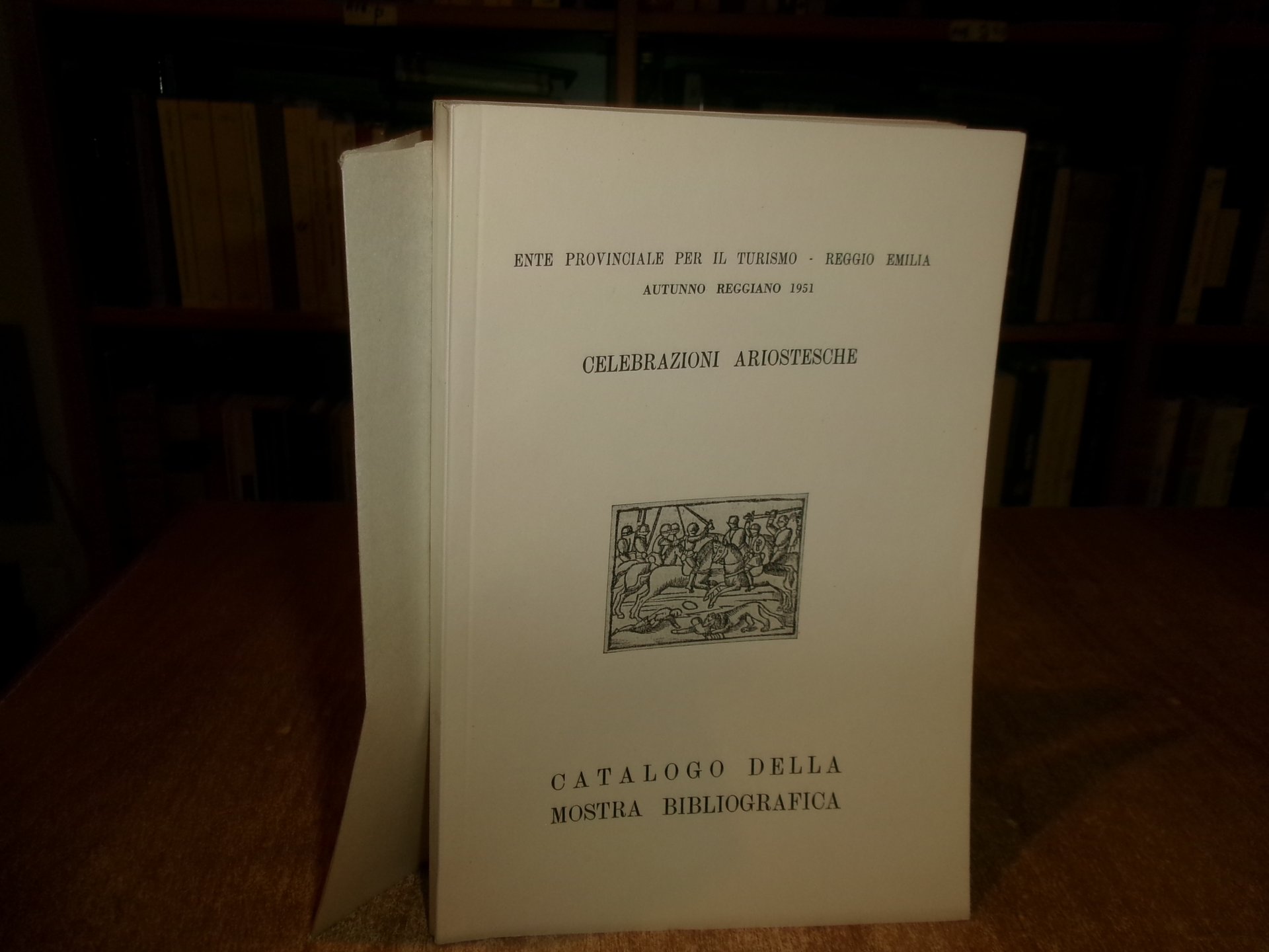 Celebrazioni Ariostesche. CATALOGO DELLA MOSTRA BIBLIOGRAFICA. Edizioni in lingua italiana dell' Orlando Furioso. Traduzioni - Fonti e derivazioni. Reggio Emilia, Ente Provinciale per il Turismo, Autunno Reggiano, 1951. In-8°, br. edit. con sovracopertina in velina trasparente. 87, (2) pp. Tiratura di 525 esemplari dei quali 400 in commercio. Come nuovo. Neg. mob. nero P - P entro busta trasp.