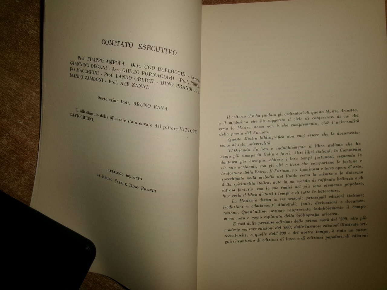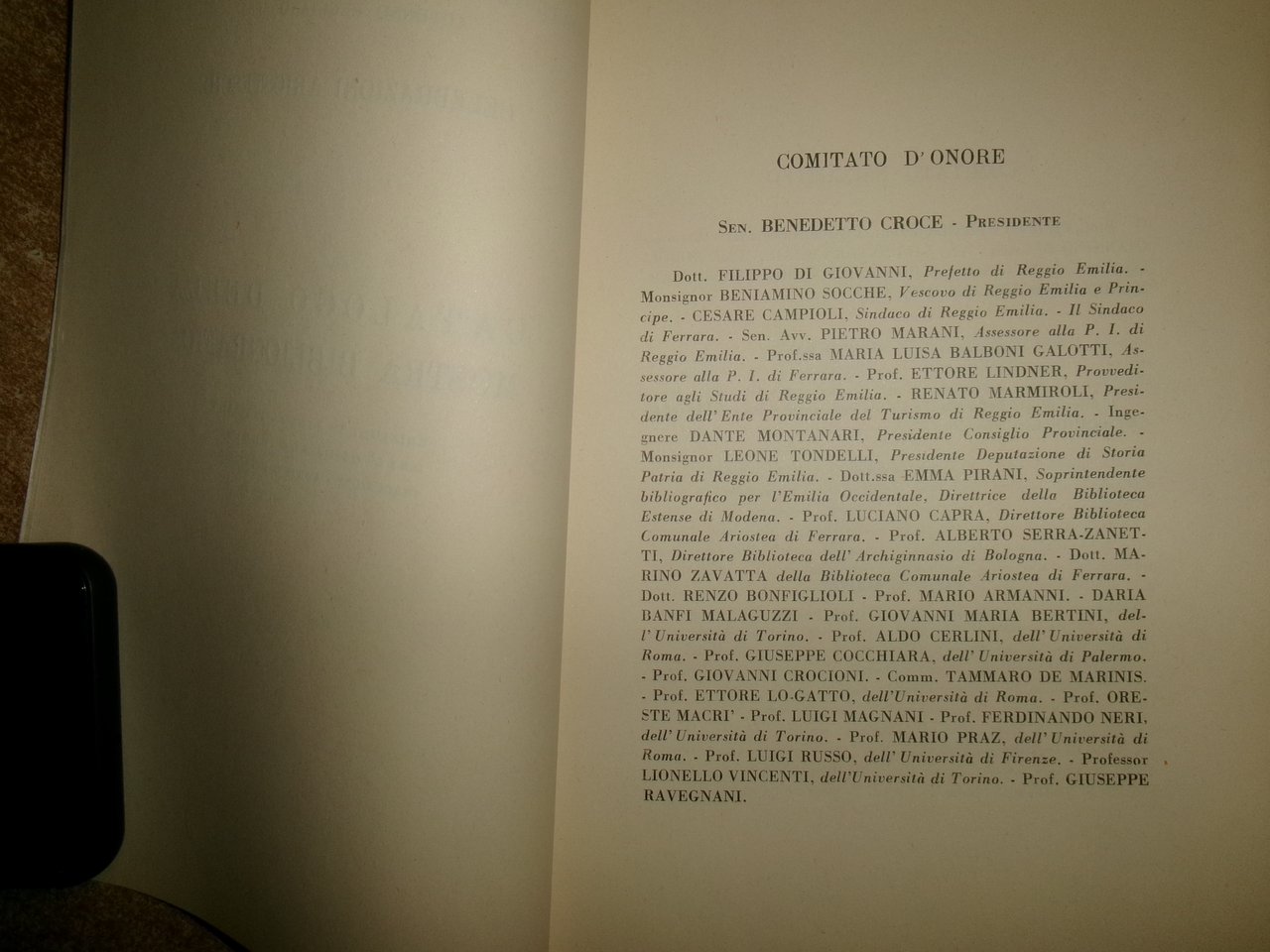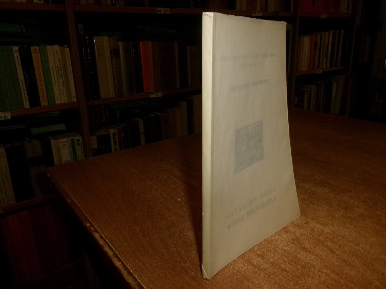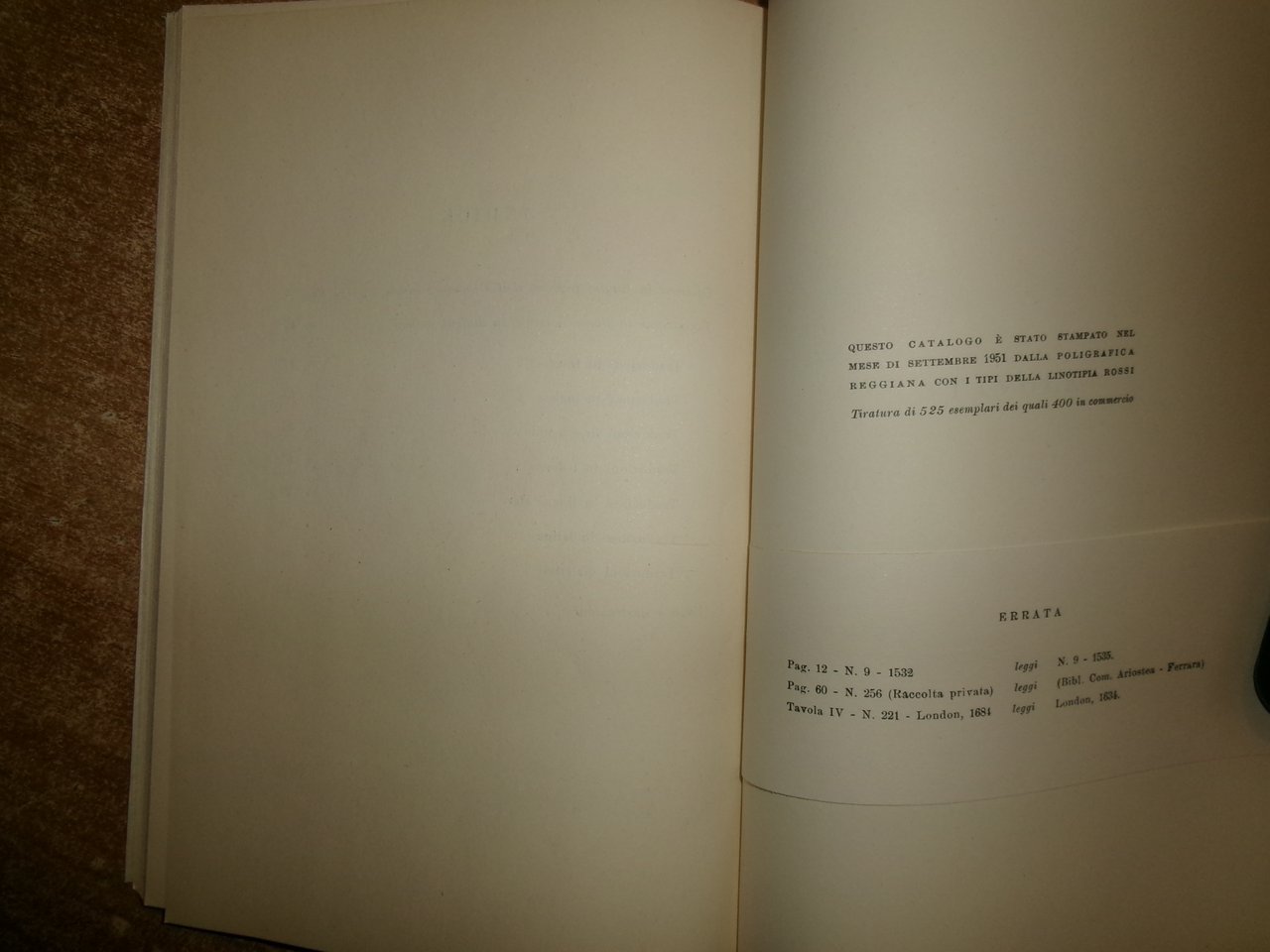 Celebrazioni Ariostesche. CATALOGO DELLA MOSTRA BIBLIOGRAFICA. Edizioni in lingua italiana dell' Orlando Furioso. Traduzioni - Fonti e derivazioni. Reggio Emilia, Ente Provinciale per il Turismo, Autunno Reggiano, 1951. In-8°, br. edit. con sovracopertina in velina trasparente. 87, (2) pp. Tiratura di 525 esemplari dei quali 400 in commercio. Come nuovo. Neg. mob. nero P - P entro busta trasp.