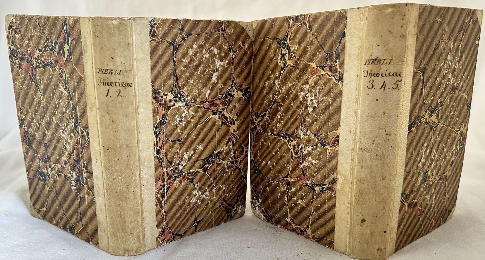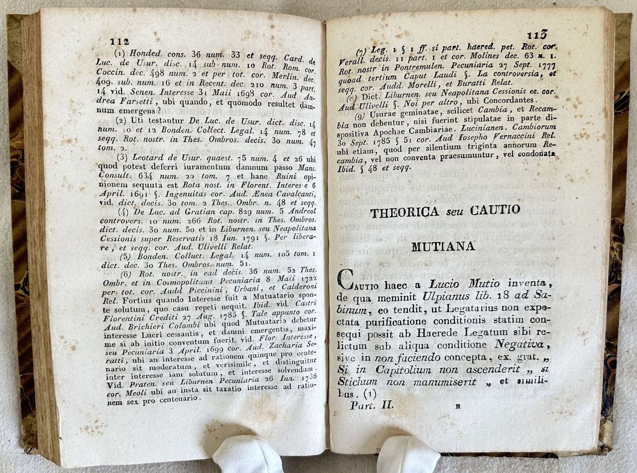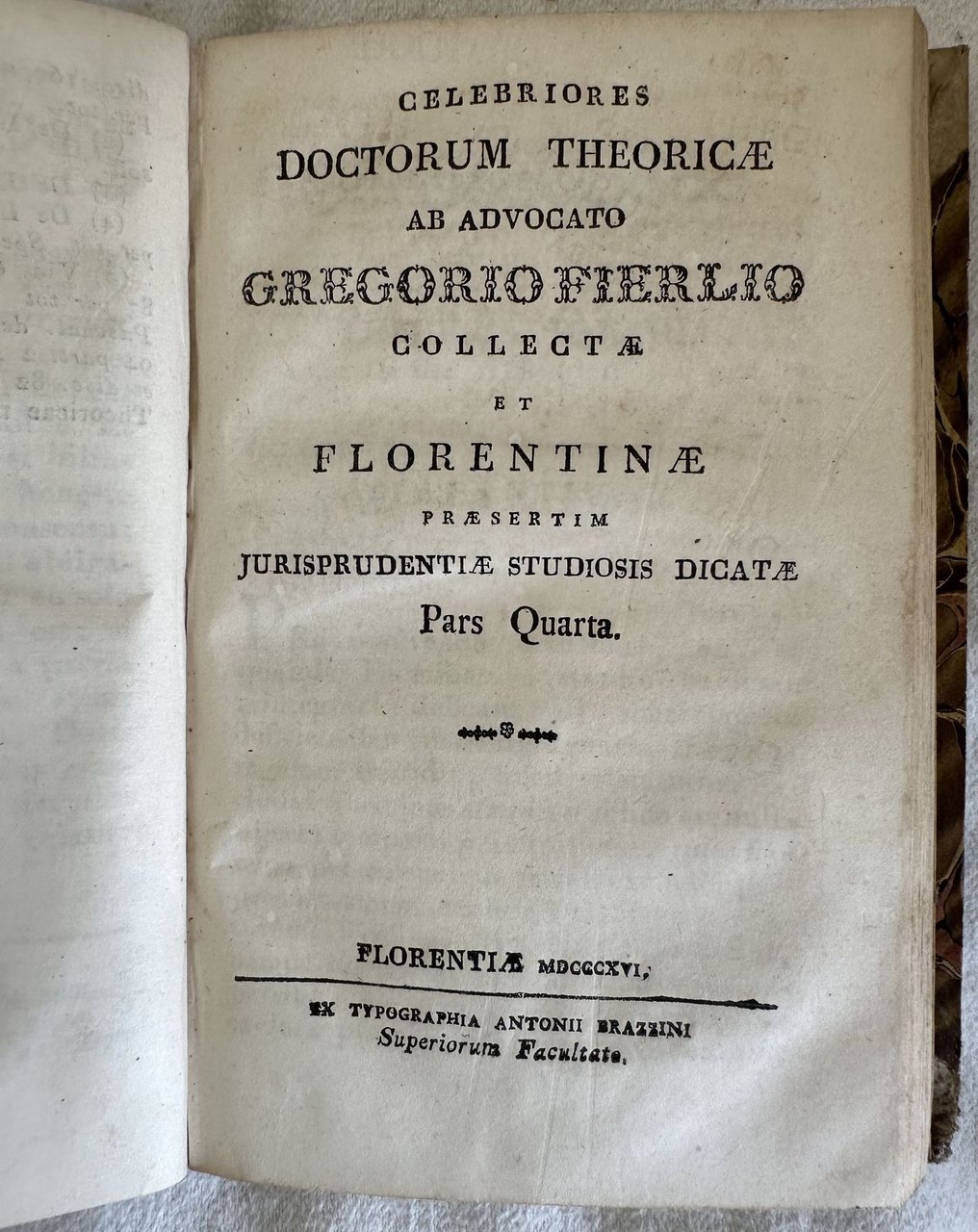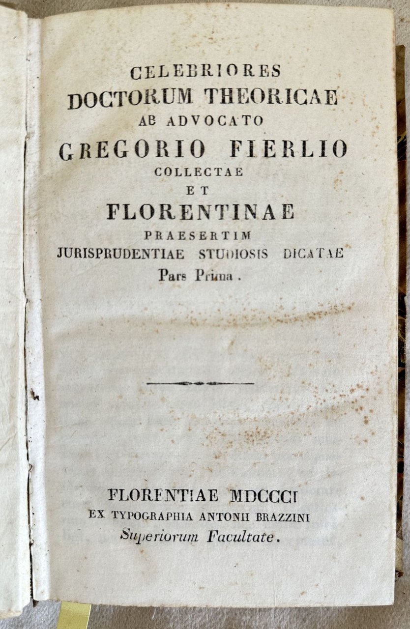 Edizione fiorentina del 1801-16 di questa opera di diritto dell'Avvocato Gregorio Fierli (Cortona 1744- Firenze 1807). Fierli frequentò i corsi di giurisprudenza presso l'Univeristà di Pisa dove seguì l'insegnamento di Guadagni, Vannucchi e Paribeni ottenendo il dottorato in diritto civile il 14 maggio 1766 con S. Bicci, Proseguì la pratica di avvocatura nello studio di Giovanni Paolo Ombrosi. L'opera, una raccolta di sentenze e decisioni dei tribunali di Firenze è formata da cinque tomi raccolti in due volumi ed è completa. In ottime condizioni. Copertina in mezza pergamena con titolo manoscritto al dorso in ottime condizioni generali con lievi usure ai margini e dorso. Legatura in buone condizioni. All'interno le pagine si presentano in buone condizioni con rare fioriture. Nella seconda parte e pagine 193, 195, 197, 199 sono state inserite doppie. In 16. Dim. 18,5x12,5 cm. Pp. 238+(2)+199+(1), 159+(1)+159+172. Florentine edition of 1801-16 of this work byt he florentine lawyer Gregorio Fierli (Cortona 1744- Firenze 1807). Fierli attended law courses in the University of Pisa with Guadagni, Vannucchi e Paribeni obtaining the degree in civil right the 14th of may 1766 with S. Bicci, He continued the practice of lawyer in the study of Giovanni Paolo Ombrosi. The work, a colection of decisions and sentences of the trial of FLorence is amde up of five tomes bound in two volumes and it is complete. In very good conditions. Half parchment coeval cover with handwritten title in the spine in very good general conditions lightly worn in the extremities. Binding in good conditions. Inside pages are in good conditions with occasional foxing. in the second part the pages 193, 195, 197, 199 have been bound double. In 16. Dim. 18,5x12,5 cm. Pp. 238+(2)+199+(1), 159+(1)+159+172.