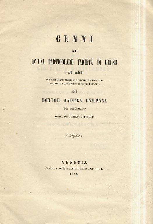 Cenni su d'una particolare varietà di gelso e sul metodo di moltiplicare, piantare e coltivare i gelsi onde ottenere un abbondante prodotto di foglia.