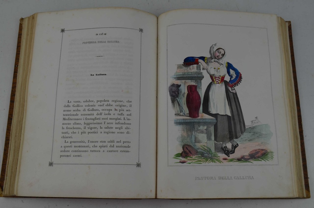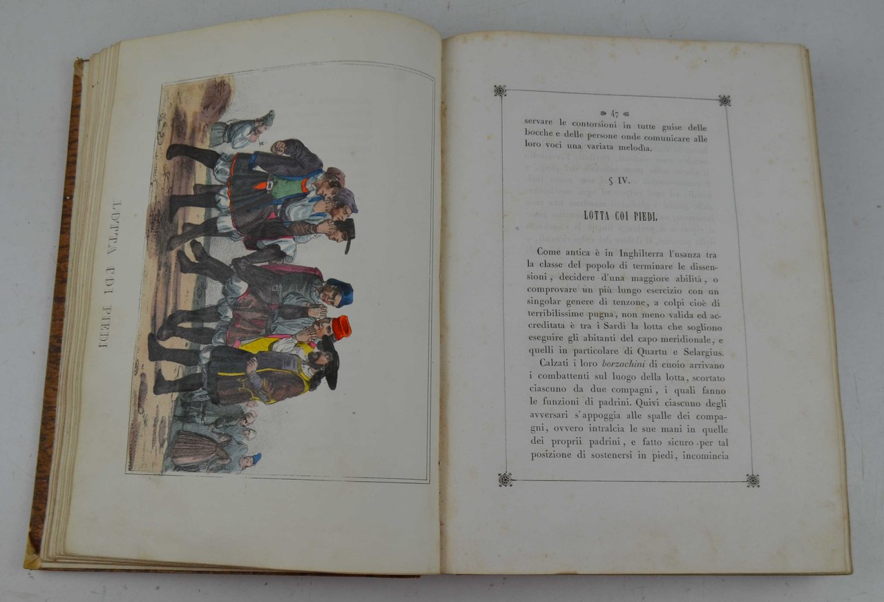 Cm. 26,5, pp. (2) 280 (4). Con frontespizio figurato, una carta geografica dell'isola ripiegata f.t. e 60 belle tavole in litografia a colori. Solida legatura coeva in mezza pelle, dorso liscio con titoli e fregi in oro. Uno strappo senza perdita alla carta geografica, privo della carta finale con l'elenco delle tavole, un restauro al verso di una tavola (senza perdite) peraltro esemplare genuino e ben conservato. Edizione originale, assai rara di quest'opera riccamente illustrata. Le tavole raffigurano vedute, scene popolari e costumi. Considerata la più bella pubblicazione dell'intero '800 dedicata alla Sardegna. Non in Lozzi, cfr. Ciasca 10037; Pregliasco, n. 28.