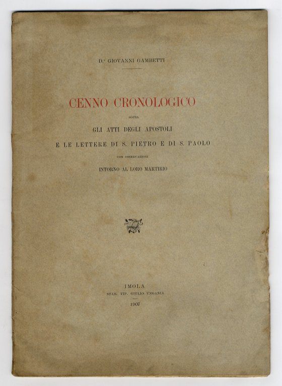 Imola, stab. tip. Giulio Ungania, 1907, in-4 grande, br. editoriale, pp. 27, [5]. Prima edizione. Manca la copertina posteriore. Evidenti gore marginali.