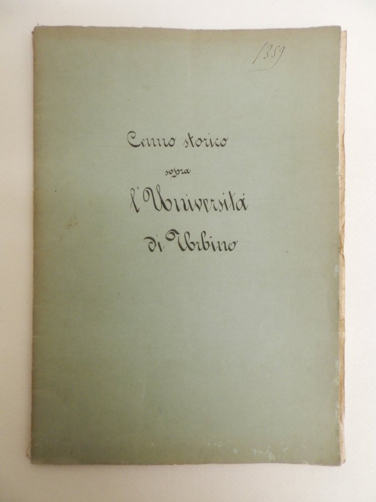 4^, pp. 18, brossura coeva verde con bel titolo manoscritto al piatto. Ottimo esemplare di raro opuscolo, censito in 2 copie nelle biblioteche italiane. Forse la più antica monografia sull'università urbinate. "Sulla storia della Università degli Studi di Urbino mancano vere monografie, quest'opera, composta dall'allora bibliotecario della Università difetta non poco di esattezza, specialmente nella parte riguardante l'origine dell'Università". Così scrive Antonio Vanni, rettore dell'università nel 1910 e autore a sua volta di una Breve monografia sulla Università degli Studi di Urbino. In verità la pubblicazione fu molto apprezzata all'epoca come certifica un bifolio manoscritto allegato al volume e firmato dalla comunità di Urbino (1875) che ringrazia l'autore per la sua opera. . *** TUTTI I NOSTRI LIBRI SONO VISIBILI PREVIO CONTATTO MAIL O TELEFONO NELLA NUOVA SEDE DI MILANO: LIBRERIA COSMOPOLIS, VIA JOMMELLI, 22. ***