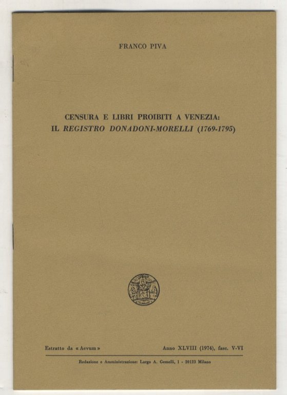 Milano, "Aevum", 1974, in-8, br. editoriale, pp. [2], numerate da 547 a 569, [1]. Il Registro in questione è il codice cl. IV, n. 506 della biblioteca Querini-Stampalia, intitolato "Registro de' libri fermati nelle dogane dal Revisore Deputato D. Antonio Maria Donadoni e dal suo successore Don Giacomo Morelli". Estratto con invio autografo dell'autore a Carlo Cordié.