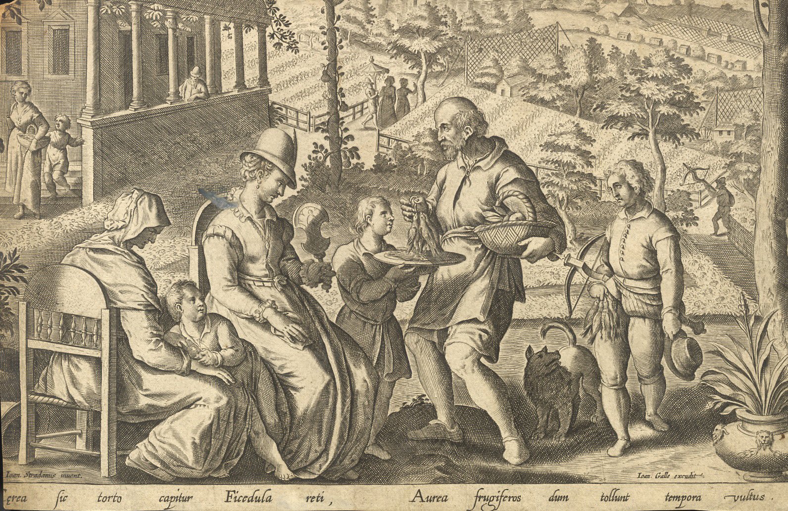 [Anversa, Ioan. Galle, fine del '500], incisione in rame, mm. 180x272, raffigurante una scena di caccia agli uccelli con le reti. Firmata in lastra: Ioannes Stradanus inven. - Ioan. Galle excudit. Incollata su cartone. Maldestramente rifilata con sensibile perdita di parte incisa su tutti i lati.