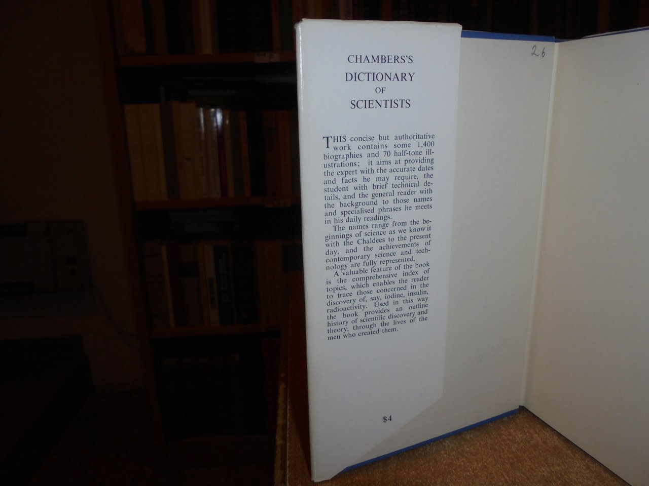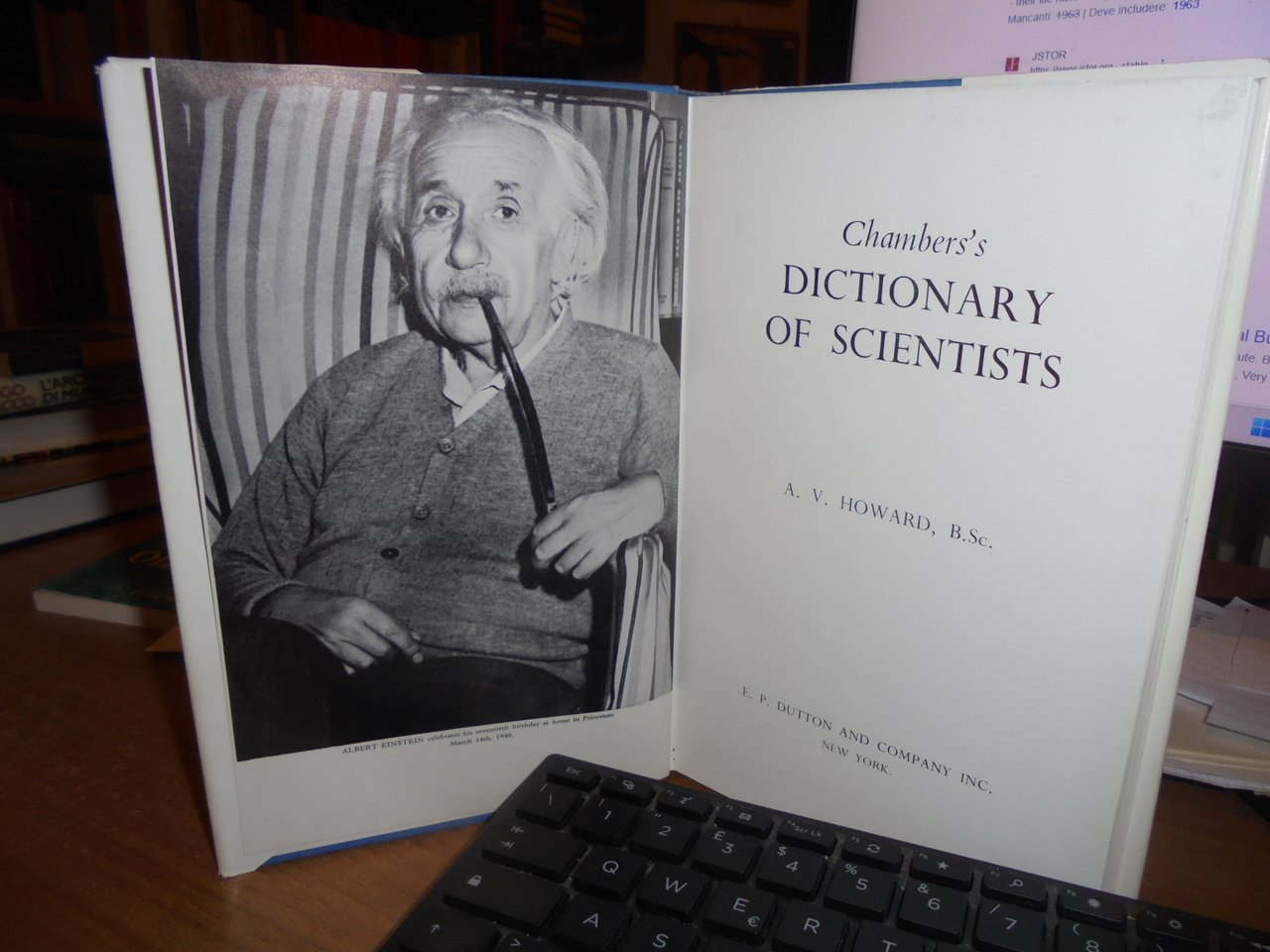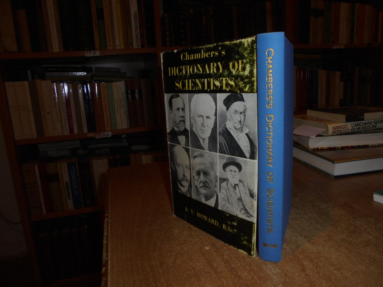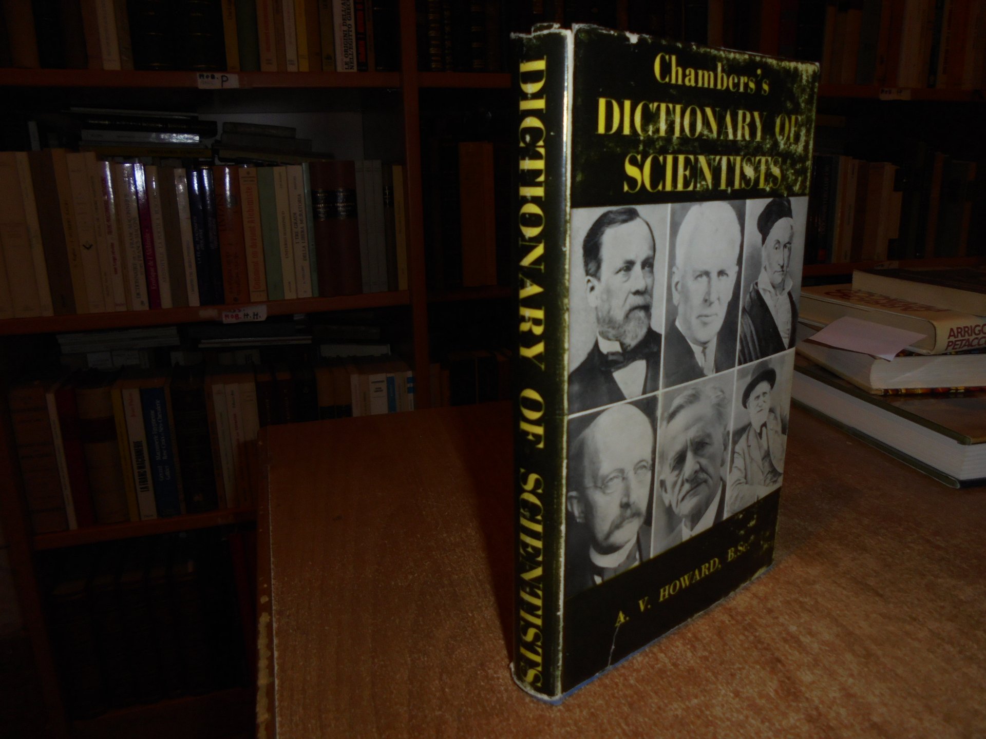 CHAMBERS'S DICTIONARY of SCIENTIST. A. V. HOWARD. New York. Dutton and Company, 1963. In-8°, tela edit. con titolo in oro al dorso, sovracopertina (leggermente scolorita). xxii, 500 pp. (numerazione pagine per colonne). Sovracopertina con scoloriture ma libro in ottimo stato di conservazione. Neg. scienze mob. R