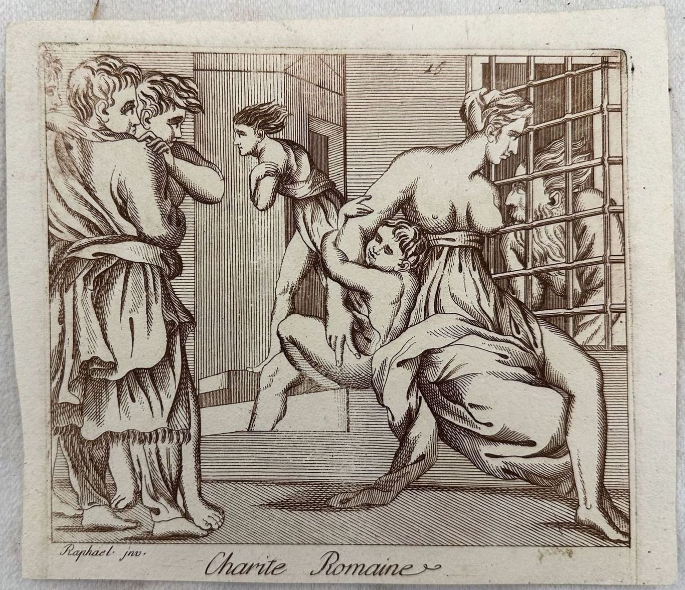 Bella incisione calcografica che mostra il dipinto "Carità romana" su soggetto di Raffaello. Data: 1840 circa Tecnica: calcografia Dimensione del foglio: 172x150 mm Dimensione incisione: 150x137 mm Condizioni: Ottime. Alcune fioritureBeautiful calcographic engraving showing the painting "Roma Charity" on subject of Raffaello Date: 1840 circa Technique: calcography Page size: 172x150 mm Engraving size:150x137 mm Conditions: Very good conditions. Some foxing.