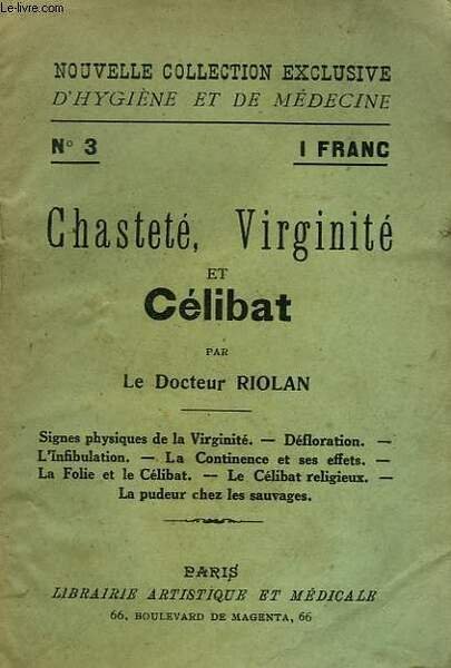 CHASTETE, VIRGINITE ET CELIBAT. SIGNES PHYSIQUES DE LA VIRGINITE, DEFLORATION, L'INFIBULATION, LA CONTINENCE ET SES EFFETS, LA FOLIE ET LE CELIBAT, LE CELIBAT RELIGIEUX, LA PUDEUR CHEZ LES SAUVAGES.