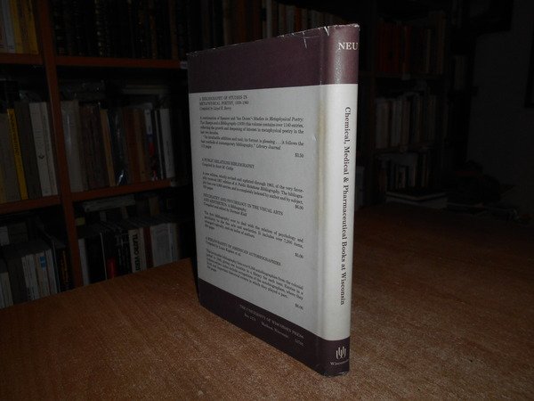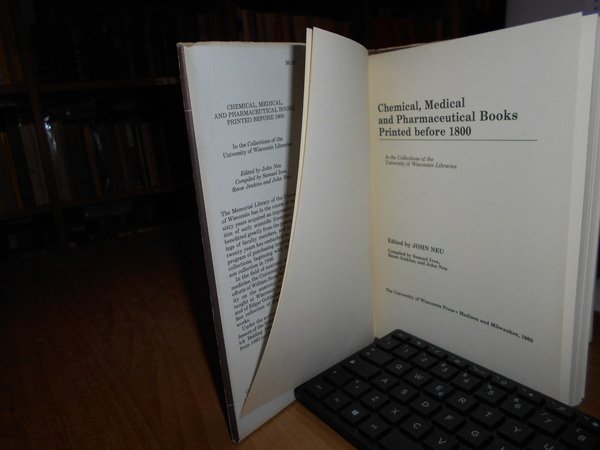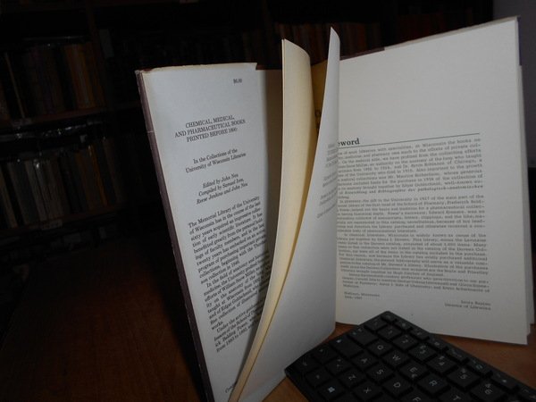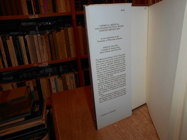Compiled by SAMUEL IVES. U.S.A. The University of Wisconsin Press, 1965. Chemical, Medical, and Pharmaceutical Bookd Printed Before 1800 in the Collection of the University of Wisconsin Libraries. In-8°, tela edit. con titolo on oro al dorso, sovracopertina. viii, 280 pp. Sovracopertina con lievi segni del tempo ma libro come nuovo. Uff. D - III - 5 - 2