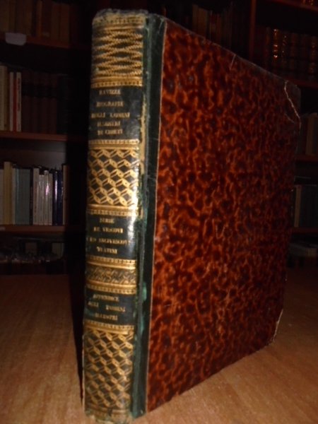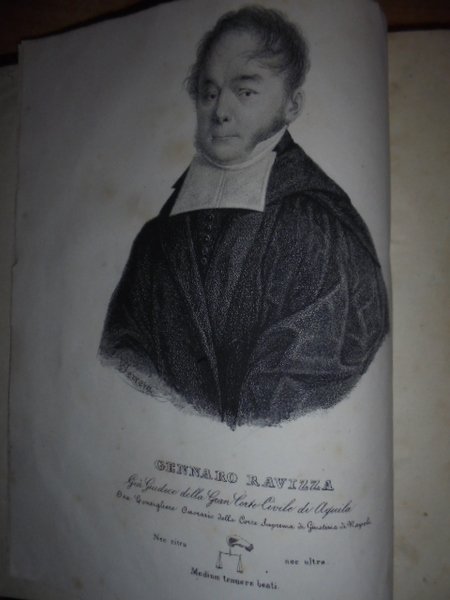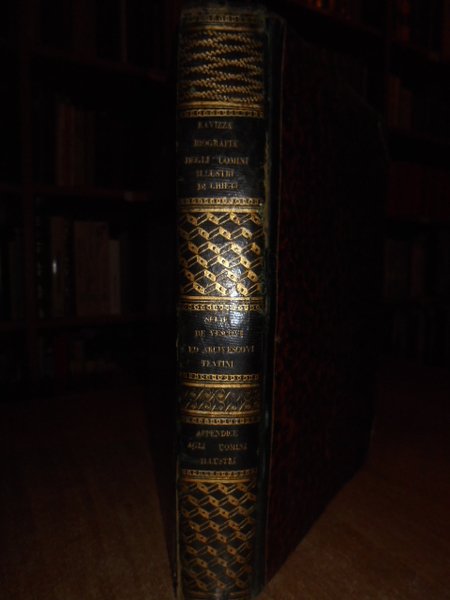 (CHIETI) RAVIZZA, Gennaro. Napoli, Da' Torchi di Raffaele Miranda, 1830. Notizie biografiche che riguardano gli uomini illustri della città di Chieti e domiciliati in essa distinti in santita' dottrina e dignità tratte da diversi autori accresciute e pubblicate con annotazioni da Gennaro Ravizza. Rara edizione originale. In-4°, m. pelle coeva con fregi e titoli in oro al dorso. I. 160, (2) pp., ritratto dell' Autore lit. f.t. Appendice: 135, (1) pp. II. 58, (2) pp. Qualche pagina posposta nella prima parte. Opera rara e completa. Neg. mob. 14 alto
