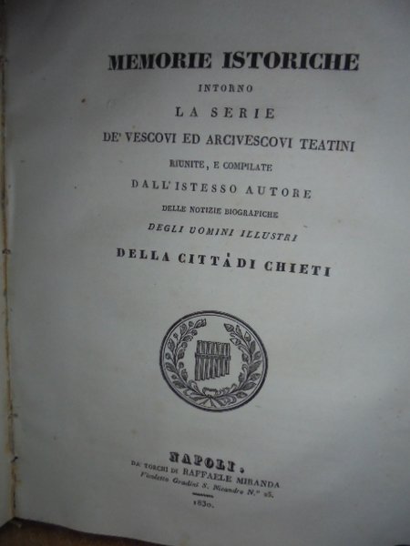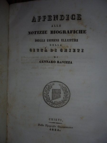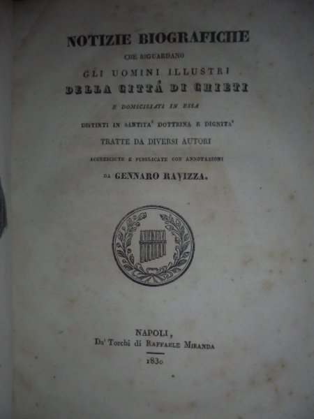 (CHIETI) Notizie biografiche che riguardano gli uomini illustri della città di Chieti e domiciliati in essa distinti in santita' dottrina e dignità tratte da diversi autori accresciute e pubblicate con annotazioni da Gennaro Ravizza.