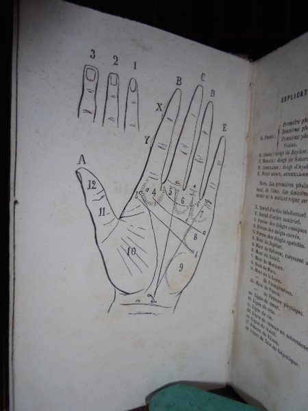Jules, Andrieu. Paris, J. Taride, 1860. Chiromancie: études sur la main, le crane, la face. In-16°, m. pelle, titolo in oro sul dorso. (8), 151, (1) pp. con una tavola in antiporta raffigurante una mano. Ben conservato. Prima edizione dell' autore francese che tratta i vari aspetti e la storia tradizionale della chiromanzia, e la topografia della mano, i sette tipi umani, i sette pianeti, la chiromanzia nelle strade e nelle abitazioni fino a toccare temi quali l' amore, le donne e le vocazioni. Caillet, 287. Manca al Dorbon. Neg. esot. mob. 60