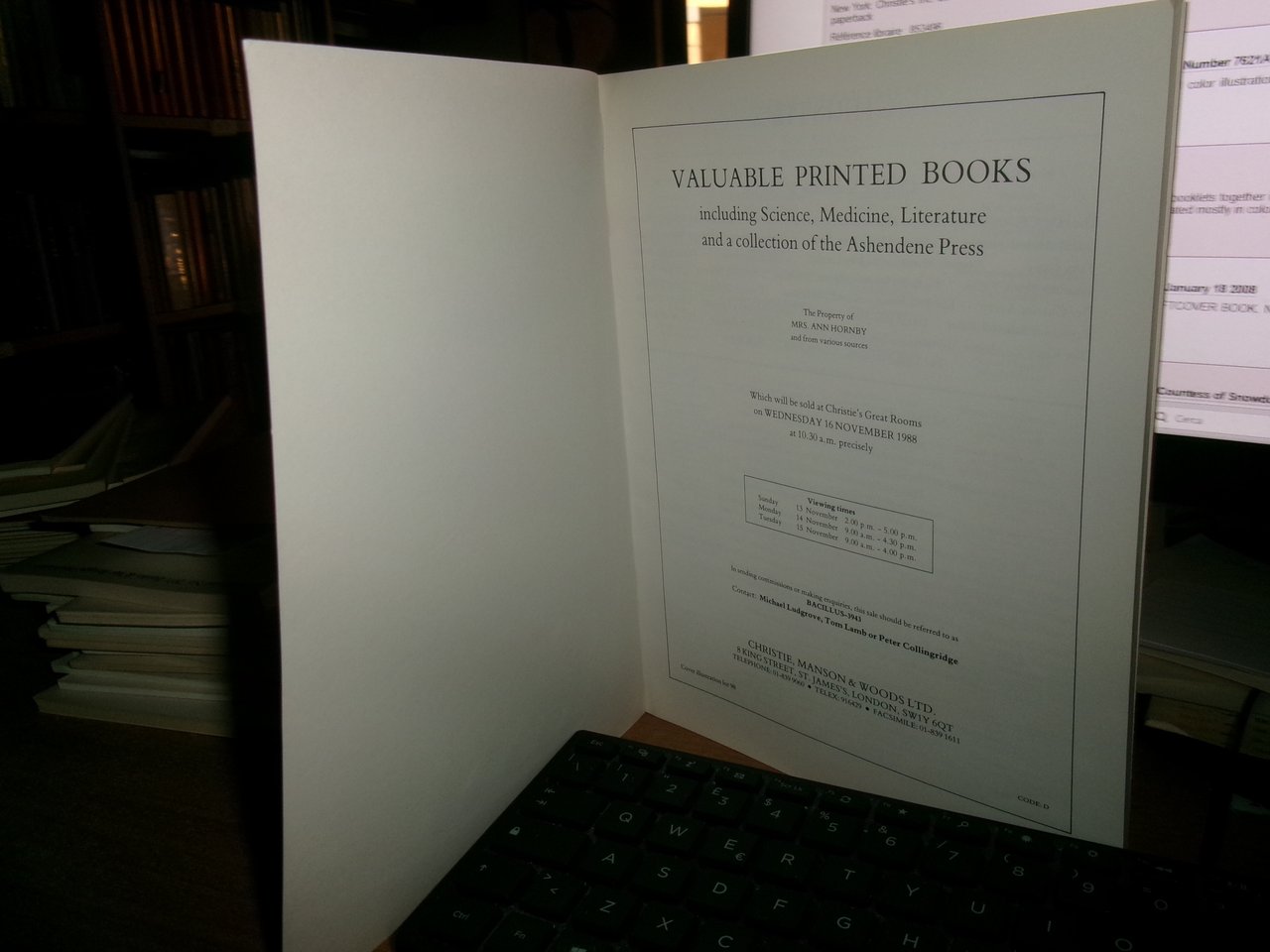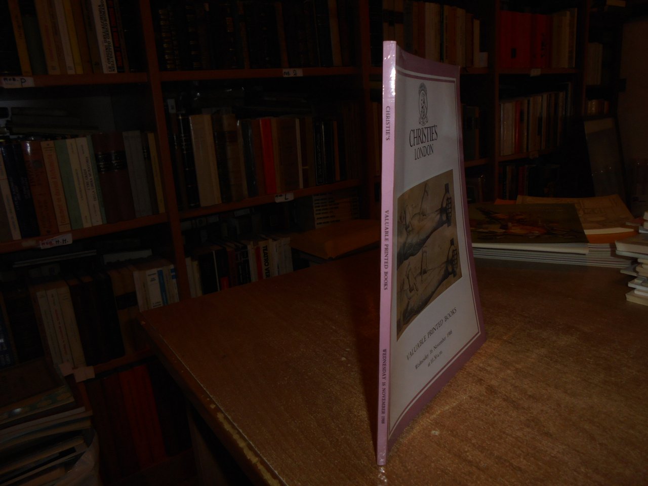 CHRISTIE'S LONDON Valuable Printed Books including Science, Medicine, Literature and a collection of the Ashendene Press. November, 1988. In-8°, cart. edit. 96 pp. con numerose riproduzioni anche a colori n.t. Accurata descrizione di 291 opere rare con prezzi in sterline. Come nuovo, testo in inglese. Neg. mob. nero 10