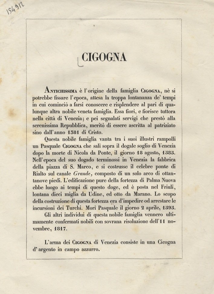 Lodi, Wilmant e figli, 1841-1848, in-4, privo di brossura, pp. [2]. Con un bello stemma accuratamente miniato a mano all'epoca, in vividi colori, con particolari dorati, su una tavola f.t. Fascicolo a fogli sciolti, dedicato alla storia della famiglia, tratto da "Teatro araldico, ovvero Raccolta generale delle armi ed insegne gentilizie delle più illustri e nobili casate che esisterono un tempo e che tuttora fioriscono in tutta Italia" di Leone Tettoni e F. Saladini, Lodi, Wilmant e figli, 1841-1848. Ottime condizioni.