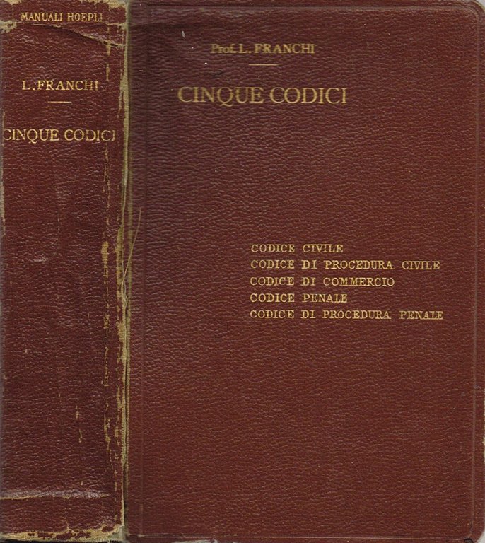Opera composta da cinque volumi rilegati in un unico tomo, Codice Civile, VII edizione, di 258 pagine; Codice di Procedura Civile, V edizione, di 179 pagine; Codice di Commercio, VII edizione, edito nel 1920, di 214 pagine; Codice Penale VII edizione, di 96 pagine; Codice di Procedura Penale, di 286 pagine. Volume degli anni '20 del '900 in stato discreto, coperta semimorbida in similpelle, caratteri in bassorilievo su piatto anteriore e dorso, vari segni del tempo, macchietta, tracce di fioritura sparsa, tagli lievemente ambrati con incavi-segnalibro, pagine, sottili, in buono stato, prime con macchia sul margine di piede, alcuni appunti a penna. Indice generale alfabetico. Fa parte della collana Manuali Hoepli. Numero Pagine 1033