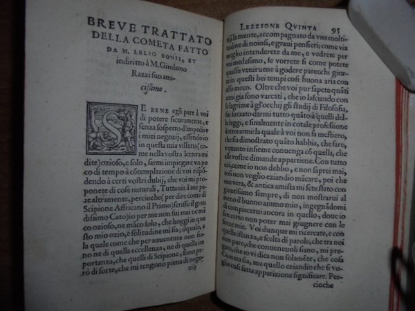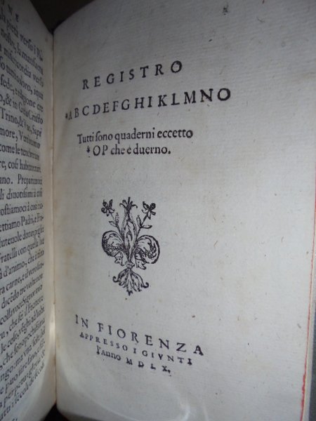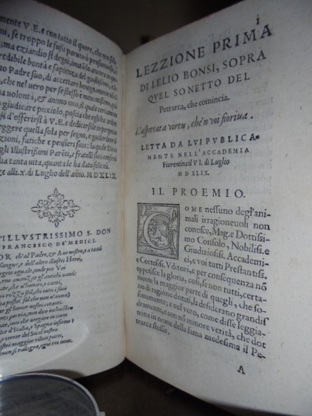 Lelio, Bonsi. Firenze, appresso i Giunti, 1560. CINQUE LEZZIONI DI M. LELIO BONSI DA LUI LETTE PUBLICAMENTE NELLA ACCADEMIA FIORENTINA. AGGIUNTOVI UN BREVE TRATTATO DELLA COMETA, E NELLA FINE UN SERMONE SOPRA L'EUCARESTIA DA DOVERSI RECITARE IL GIOVEDI SANTO DEL MEDESIMO AUTORE. In-8° legatura ottocentesca in tutta tela, titolo in oro al dorso, taglio rosso, con sovracopertina in acetato. 1 f. b., 4 ff. (= 8 pp.), 111 ff. (= 222 pp.), 1 f. (= 2 pp.) in fine, 1 f. b. Prima edizione dell'opera maggiore di Lelio Bonsi, letterato e filosofo fiorentino, amico di A. Caro e B. Varchi. Dedicate a Francesco de Medici, le lezioni furono pronunciate pubblicamente all' Accademia Fiorentina e commentano testi petrarcheschi e danteschi, prendendoli a pretesto per discutere questioni scientifiche. Nella parte finale, il volume include un breve Trattato della cometa. Bonsi affronta i temi della formazione delle comete, infine del loro significato secondo gli astrologi. Fonte principale per la vita del B. è la sua opera maggiore, Cinque lezzioni di M. L. B. lette da lui publicamente nella Accademia Fiorentina aggiuntovi un breve trattato della cometa e nella fine un sermone sopra l'eucarestia da doversi recitare il giovedì santo del medesimo autore (Firenze 1560):molte notizie biografiche sono infatti desumibili dalla dedicatoria dei Giunti a Francesco de' Medici e da accenni fatti dal B. stesso nelle Lezioni e nel Trattato. Quattro delle lezioni sono dedicate a Francesco de' Medici: la prima (letta il 6 luglio 1549)commenta il sonetto petrarchesco "L'aspettata virtù, che 'n voi fioriva" (CIV) scolasticamente ma con molta cura nella ricerca delle fonti; la seconda (6 nov. 1550)commenta "Pommi ove 'l Sole occide i fiori, e l'herba" (CXLV), prendendo a pretesto i versi per proporre le questioni scientifiche che il B. poi discusse nella terza e nella quarta lezione (13 e 20 nov. 1550).L'ultima delle lezioni infine, pronunziata il 15 ott.1551 alla presenza del cardinale Alessandro Farnese e a lui dedicata, tratta dei versi di Dante sulla fortuna (Inferno, VII, 67-96)confrontandoli con le opinioni di altri poeti, filosofi, astrologi e teologi. Segue - dopo un breve Ragionamento recitato dal B. come provveditore dell'Accademia in occasione del consolato di F. Torelli - il Breve trattato della cometa, scritto in forma di lettera all'amico G. Razzi: senza alcun accenno all'osservazione diretta, il B. si limita a riferire con gran sfoggio di cultura quanto sull'argomento fu detto dagli antichi e in particolare da Aristotele. Di scarso interesse, infine, il sermone quaresimale sul mistero dell'eucaristia, che chiude il volume a testimonianza dei pii sentimenti dell'autore, che fu uomo religiosissimo e generoso benefattore di ordini monastici. Bell' esemplare. Riccardi, Corr. ed agg. II, 98. Libri, Cat. 1861, 1209. Decia, I Giunti di Firenze, 308. Gamba, Testi di Lingua, 1265. Cantamessa, 1021. Cas.