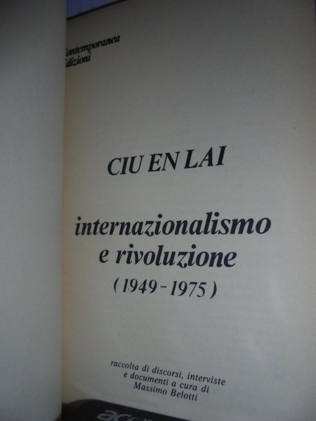A cura di Massimo Belotti. Ciu En Lai internazionalismo e rivoluzione (1949 - 1975). Milano, Moizzi Editore, 1976. In-8°, cartoncino edit. 214, (2) pp. Ben conservato. Uff. pacco C. carc.