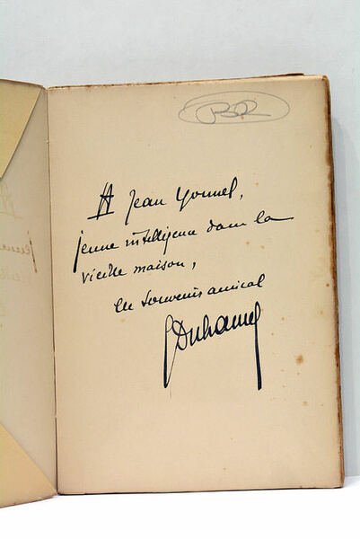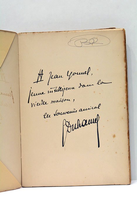 2 feuillets. Portrait de l'auteur gravé. Page de titre. 2 feuillets. 314 pages. 2 feuillets. (19x13 cm). Broché. Couverture illustrée à rabats. Tâches éparses. Petits déchirures sur la couverture. Edition tiré à 1975 exemplaires. Celui-ci est le nº 1022 sur les 1800 exemplaires sur papier des manufactures de Rives. Envoi de l'auteur sur le premier feuillet: " A Jean Younel, jeune intelligence dans la vieille maison, un souvenir amical". Ce livre-témoignage sur les ravages de la guerre sort en avril 1918 sous le pseudonyme de Denis Thévenin car Duhamel ne veut pas être accusé de profiter de la guerre pour faire de la littérature.