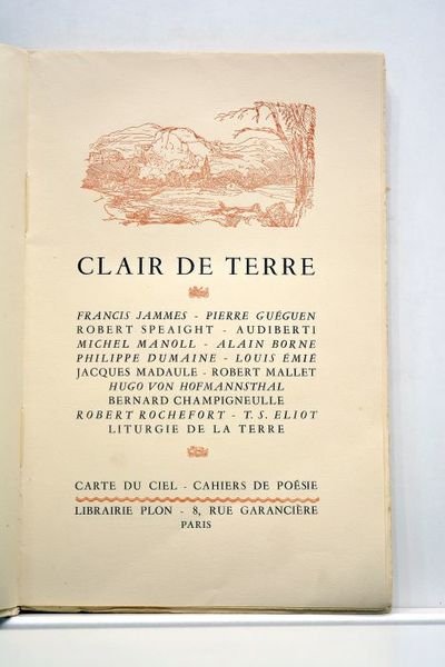 146 pages. 5 illustrations hors-texte. (16,5X25,5cm). Jaquette papier. Broché. Non coupé. Couverture illustrée. Taches et traces d'usure aux plats. Très bon état intérieur. Tiré à 1400 ex. Cahiers de poesie ; Francis Jammes, Pierre Guéguen, Robert Speaight, Audiberti, Michel Manoll, Alain Borne, Philippe Dumaine, Louis Émié, Jacques Madaule, Robert Mallet, Hugo Von Hofmannsthal, Bernard Champigneulle, Robert Rochefort, T. S. Eliot. Liturgie de la terre.