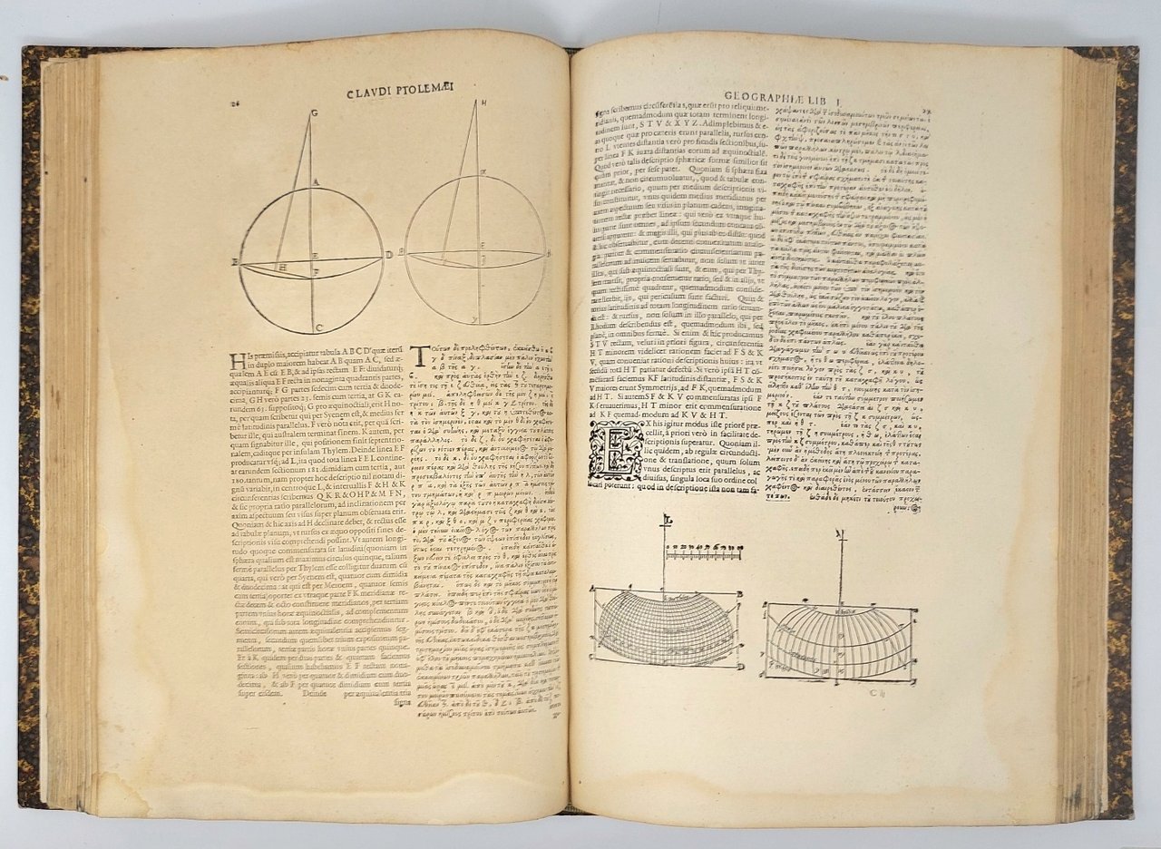 >in-folio, (409x207 mm), ff. (6, compresi titolo e ritratto), 27 carte su doppio foglio ed una su f. singolo, ff. (116, l'ultimo bianco), pp. 215, ff. (32), legatura 800esca m.pelle, titolo e fregi in oro al dorso. Frontesp. inciso, ritratto di Mercatore inciso al verso dell'ultimo f. preliminare, un planisfero contornato da ricca bordura con allegorie dei venti, 10 carte dell'Europa, 5 dell'Africa e 12 dell'Asia, decorate da ricchi cartigli; diagrammi e fregi nel testo. Prima edizione con testo greco e latino della Geographia di Tolomeo, e primo libro in greco impresso ad Amsterdam. Fu curata da Petrus Montanus (1572-1632), mentre il tipografo pare essere Jan Theusniz, che si trasferì da Leyda nel 1604. Le 28 decorative carte geografiche si debbono a Gerardo Mercatore (1512-1594) che le aveva pubblicate con il solo testo latino nel 1578 e nel 1584. Egli non si limitò a copiare e rielaborare le carte degli atlanti precedenti: la sua grandezza sta nell'aver creato delle carte originali, in base alle nuove proiezioni che portano ancora oggi il suo nome. Frontespizio con aloni di polvere e porzione di margine restaurato, lieve uniforme ingiallitura, e qualche alone marginale. Koeman Me3: ''This is the first edition with the Greek text next the Latin text... The Ptolemy edition of 1605 is the first work printed in Greek at Amsterdam and a typographic masterpiece''. Phillips 421 (nota).
