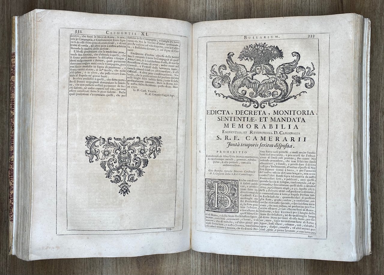 Romae, Ex typographia Reverendae Camerae apostolicae, 1723, in-folio legatura novecentesca in mezza pergamena con punte, pp. [8], 616, [16]. Mancano i fascicoli b4 e c4 (8 carte di preliminari) e l'antiporta calcografica. alcune carte mal posizionate fascicolo PP16. Variante con lo stemma del papa sul frontespizio fra i santi Pietro e Paolo e con l'apparato decorativo - iniziali, testate e finali - in xilografia. è conosciuta anche una variante iniziali e testate in calcografia, dotata di altre due tavole f.t.