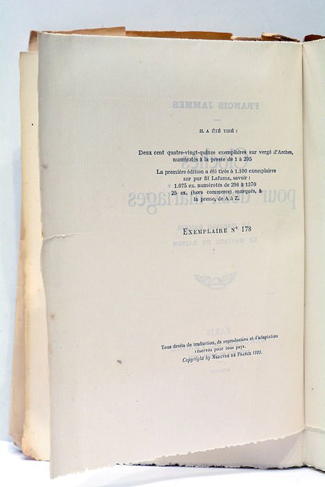 21x14 cm. 248 pages. Broché. Couverture imprimée rempliée. Petits accrocs aux bords. Petite déchirure sur la page de titre. En partie non coupé. Edition originale de ce roman de Jammes; poète, romancier et dramaturge français. L'édition est limitée à 1100 exemplaires dont le notre est le nº 178 des 295 exemplaires tiré sur vergé d'arches. Francis Jammes a porté un souffle nouveau dans la poésie française grâce à une style d'écriture empreinte de tendresse et de simplicité, marquée par l'attachement à la nature qui a enchanté tant Rainer Maria Rilke que Franz Kafka.