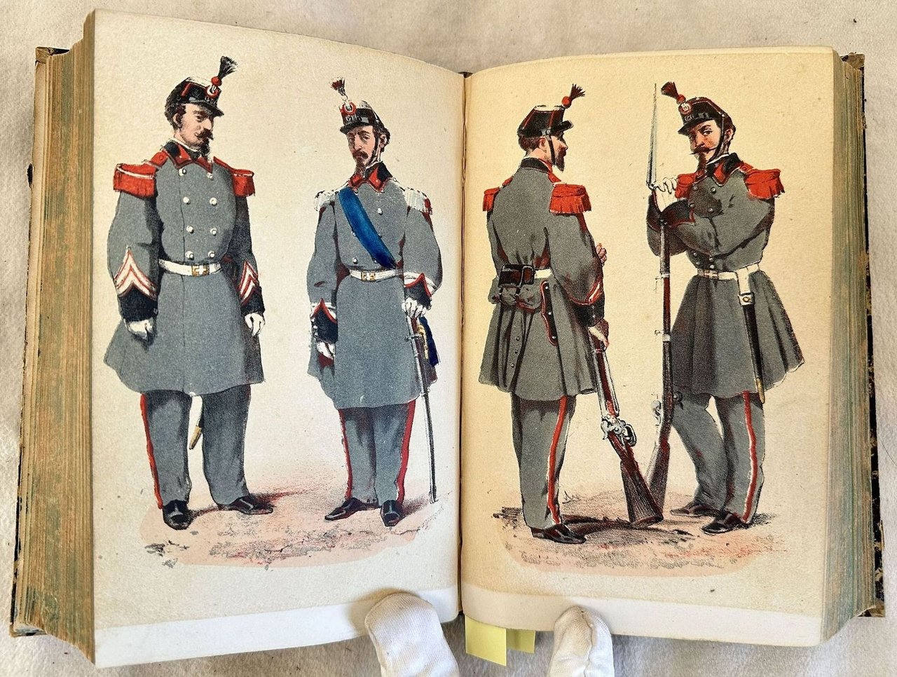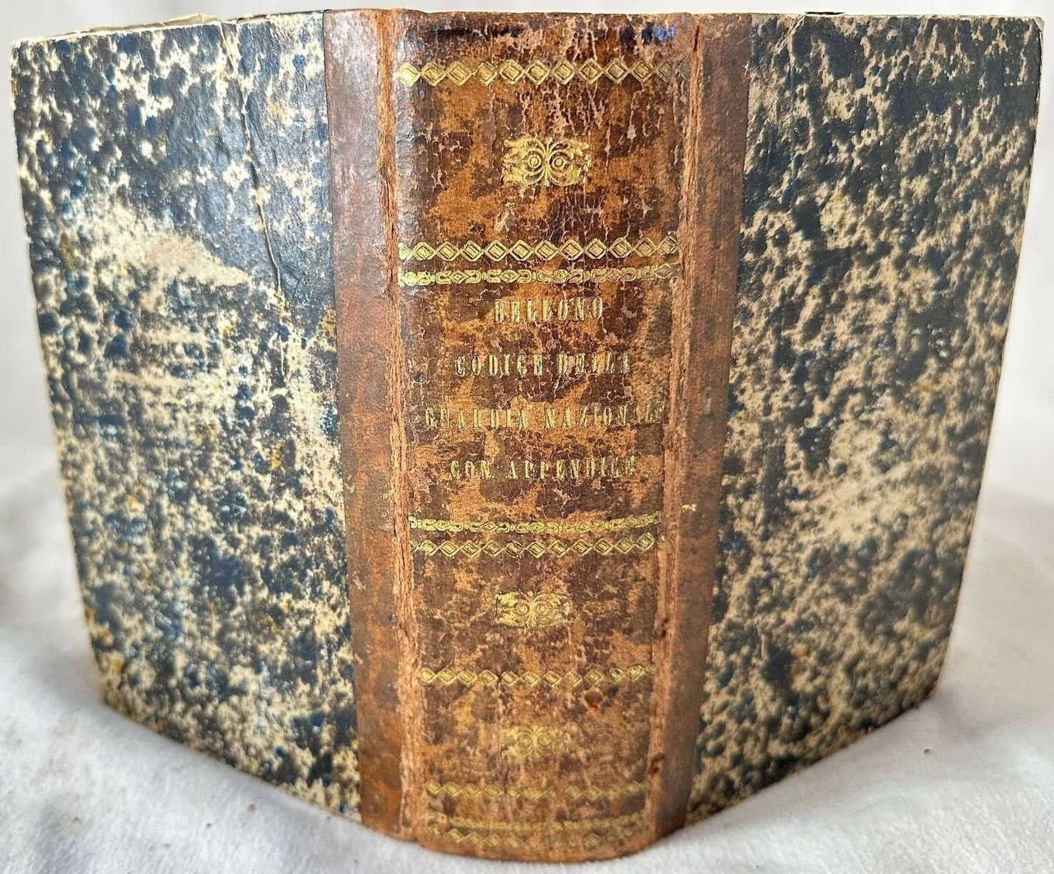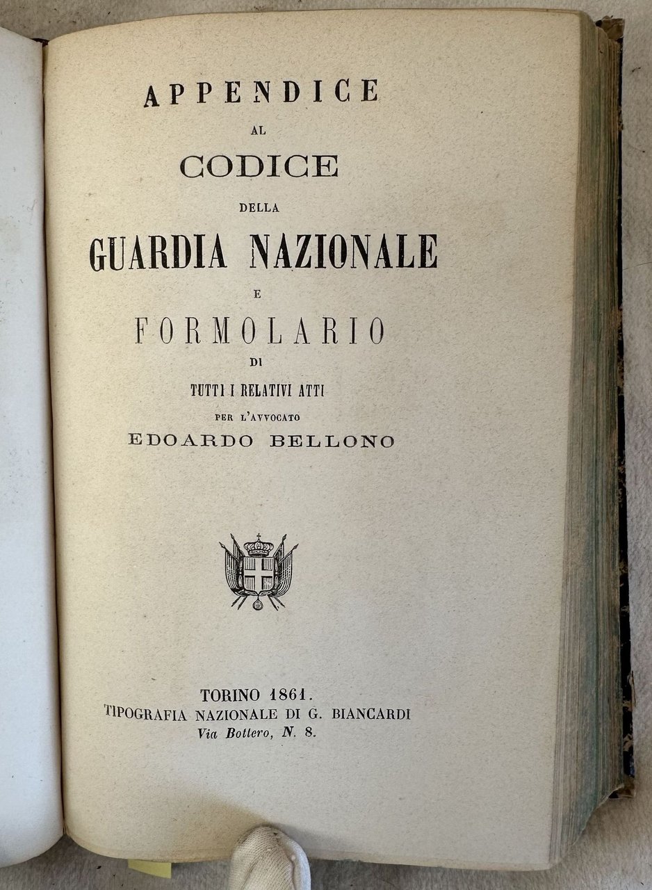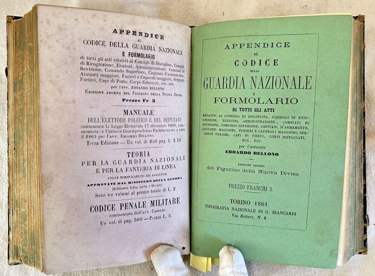 Edizione del 1861 di questo codice della Guardia Nazionale a cura di Edoardo Bellono. All'interno il testo delle leggi 4 marzo 1848 e 27 febbraio 1859 con commenti e sotto ogni articolo compendiata la giurisprudenza della Corte di Cassazione dal 1848 al 1860, i pareri del Consiglio di Stato, Le decisioni ministeriali, la correlazione dei seingoli articoli e fra loro e con quelli della legge francese del 22 marzo 1831. Seguono due appendici al Codice con formolario. All'interno sono presenti due tavole ripiegate: quattro militari in divisa e "Modello dei distintivi di grado da apporsi sul cappotto degli ufficiali". In ottime condizioni. Copertina in mezza pelle con titolo e decorazioni in oro al dorso in buone condizioni con lievi usure ai margini e dorso. Legatura in buone condizioni. Pagine in buone condizioni con fioriture. In 8. cm 19,5x12,5 cm. Pp. 525+248+215. Peso Kg. 0,830Edition of 1861 of this code for National Guard written by Edoardo Bellono. inside the text of laws 4th of march 1848 and 27th of february 1859 with comments from 1848 al 1860, i pareri del Consiglio di Stato, Le decisioni ministeriali, la correlazione dei seingoli articoli e fra loro e con quelli della legge francese del 22 marzo 1831. Then two appendix to the code with formulary. inside there are two folded plates: four soldiers with their uniforms and "Modello dei distintivi di grado da apporsi sul cappotto degli ufficiali". In very good conditions. Half leather coeval cover with gilted title and decorations in the spine in good conditions lightly worn in the extremities. Binding in good conditions. Pages in good conditions with foxing. In 8. cm 19,5x12,5 cm. Pp. 525+248+215. Peso Kg. 0,830